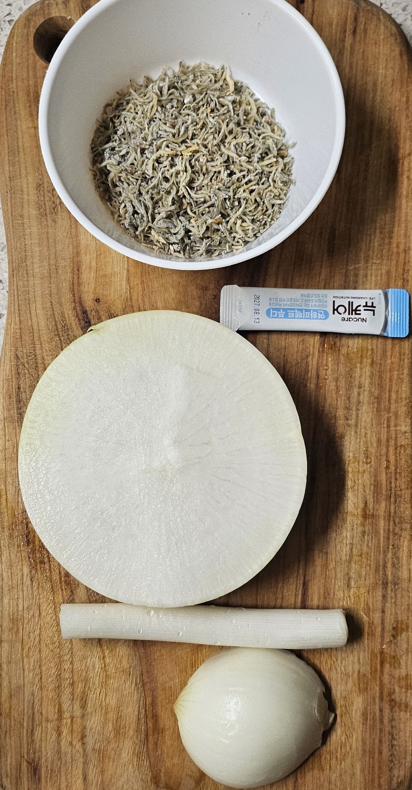 잔멸치 30 g , 양파 50 g , 대파 30 g , 연하퍼펙트푸디 2 g , 다시마우린물 600 ml , 물 400 ml , 아보카도오일 1 큰술