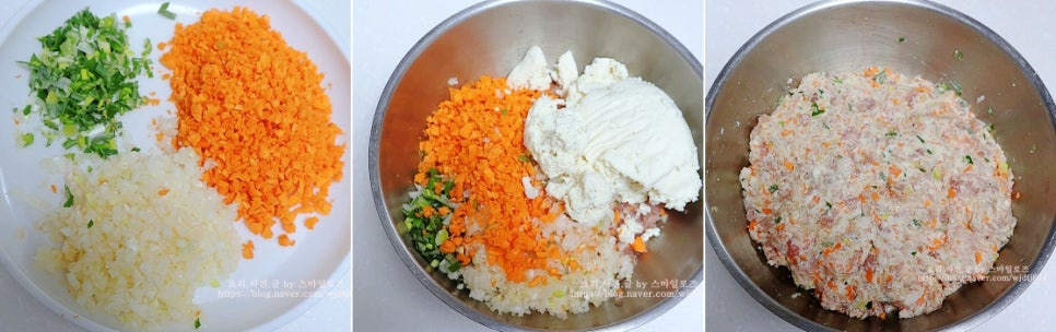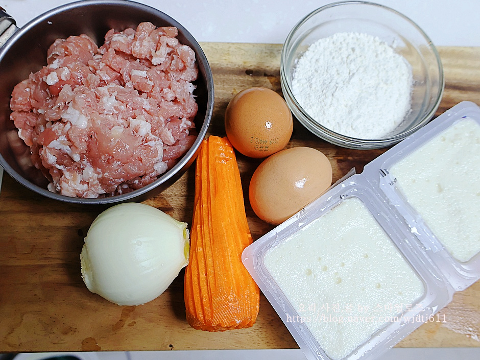 다짐육에 두부와 야채를 모두 넣고 반죽을 해주면 되는데요