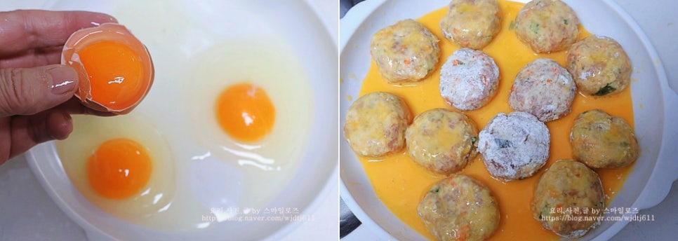 알끈을 제거하고 준비한 계란 물에 밀가루를 입힌