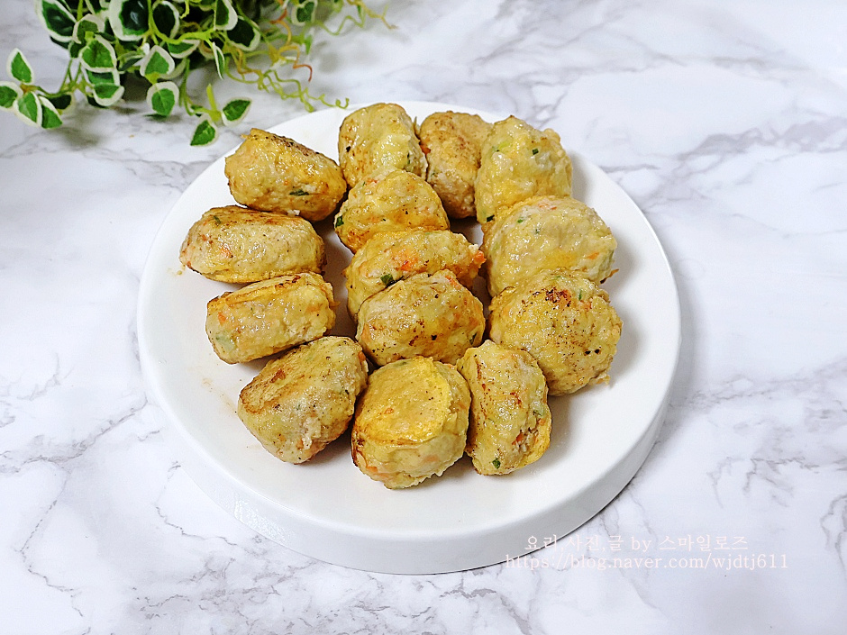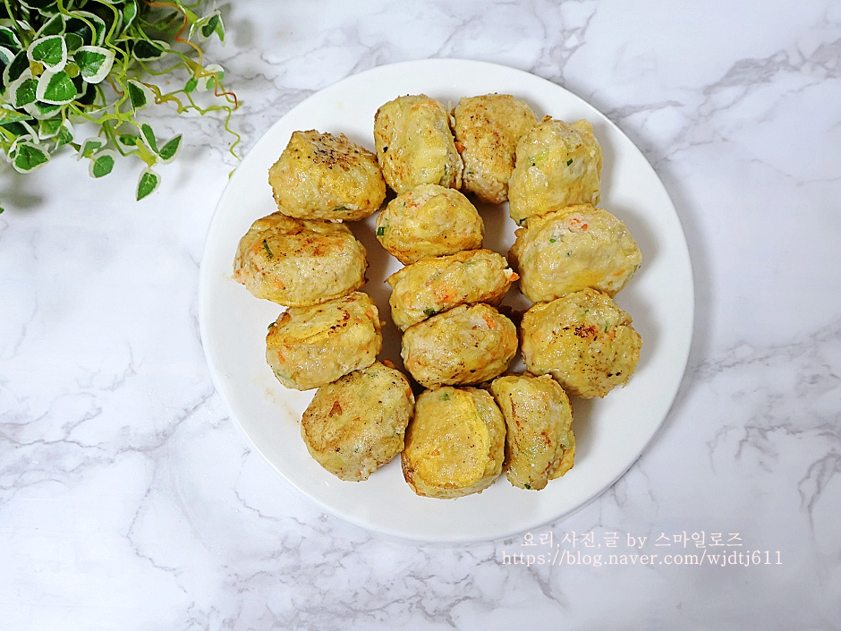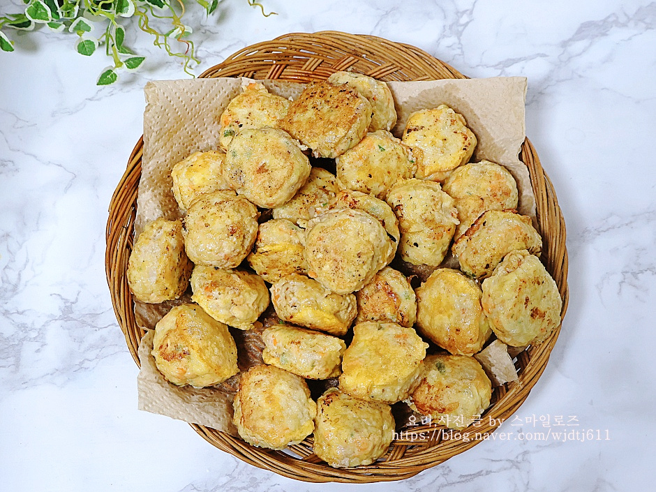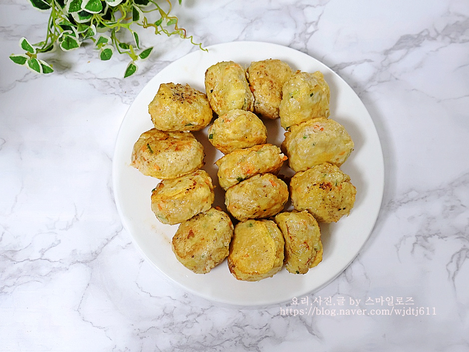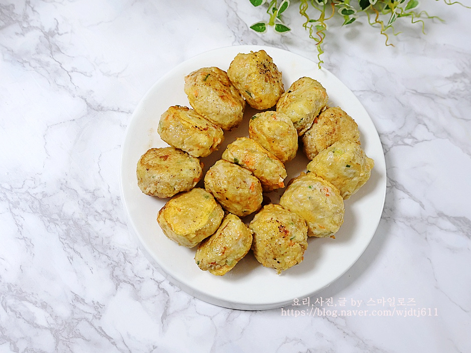 두부와 야채도 잘게 다져서 동그랗게 만들어 밀가루와 계란물을 입힌 후