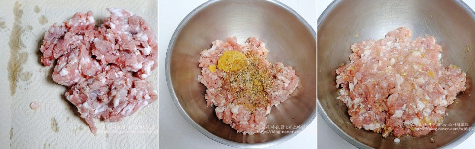 돼지고기 다짐육은 키친타월에 올려놓고 꾹꾹 눌러 핏물을 제거해 준 다음