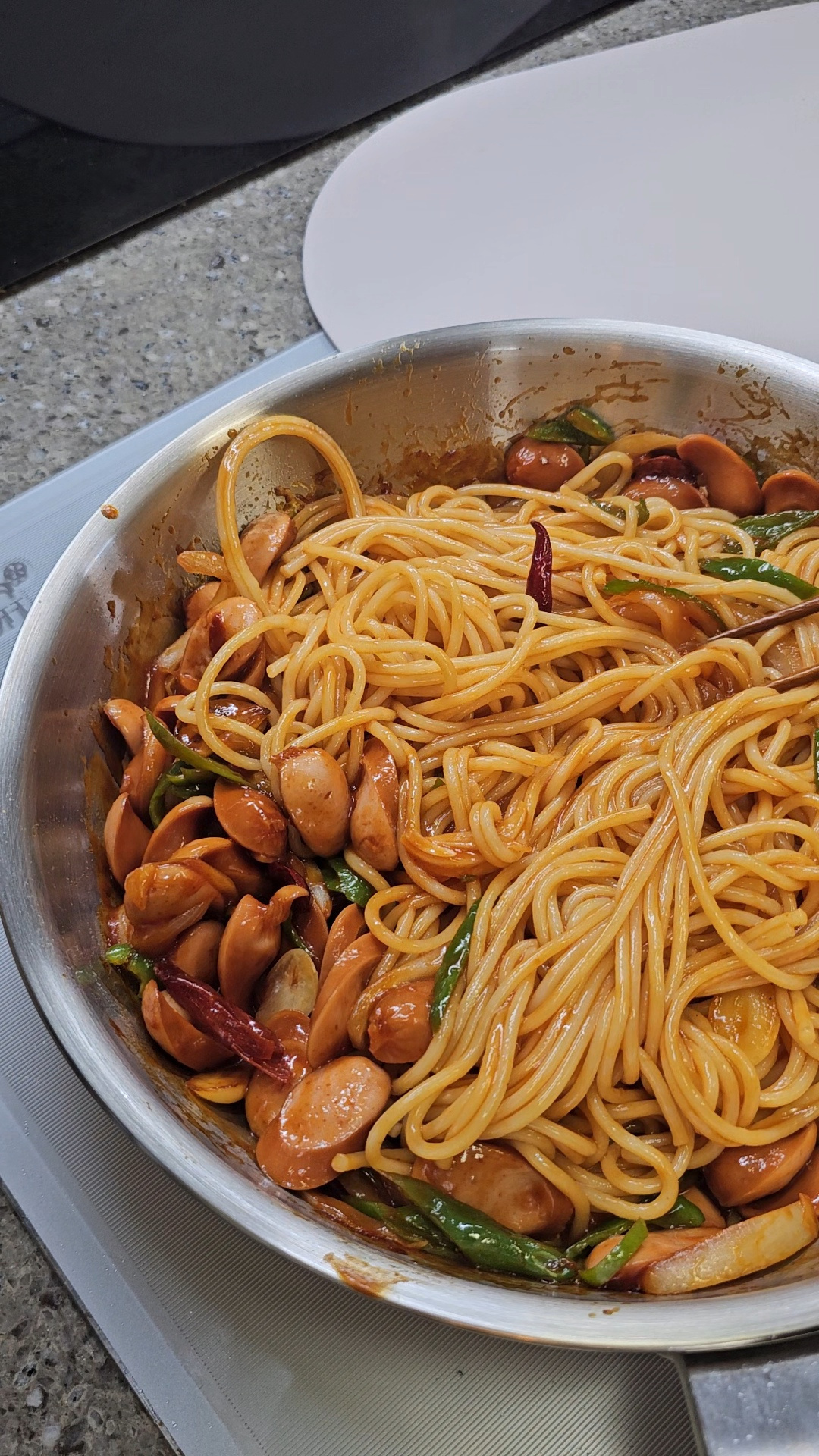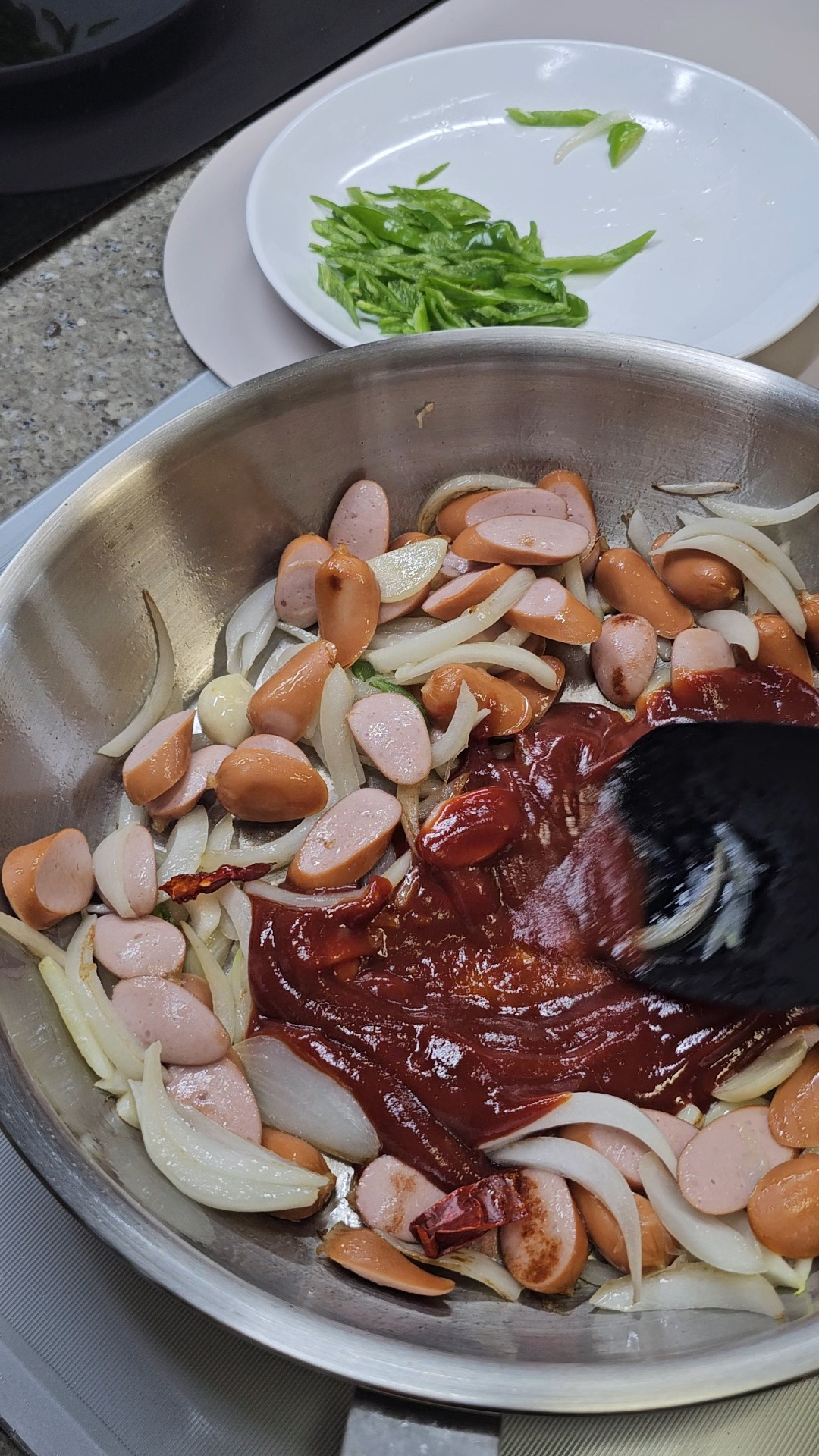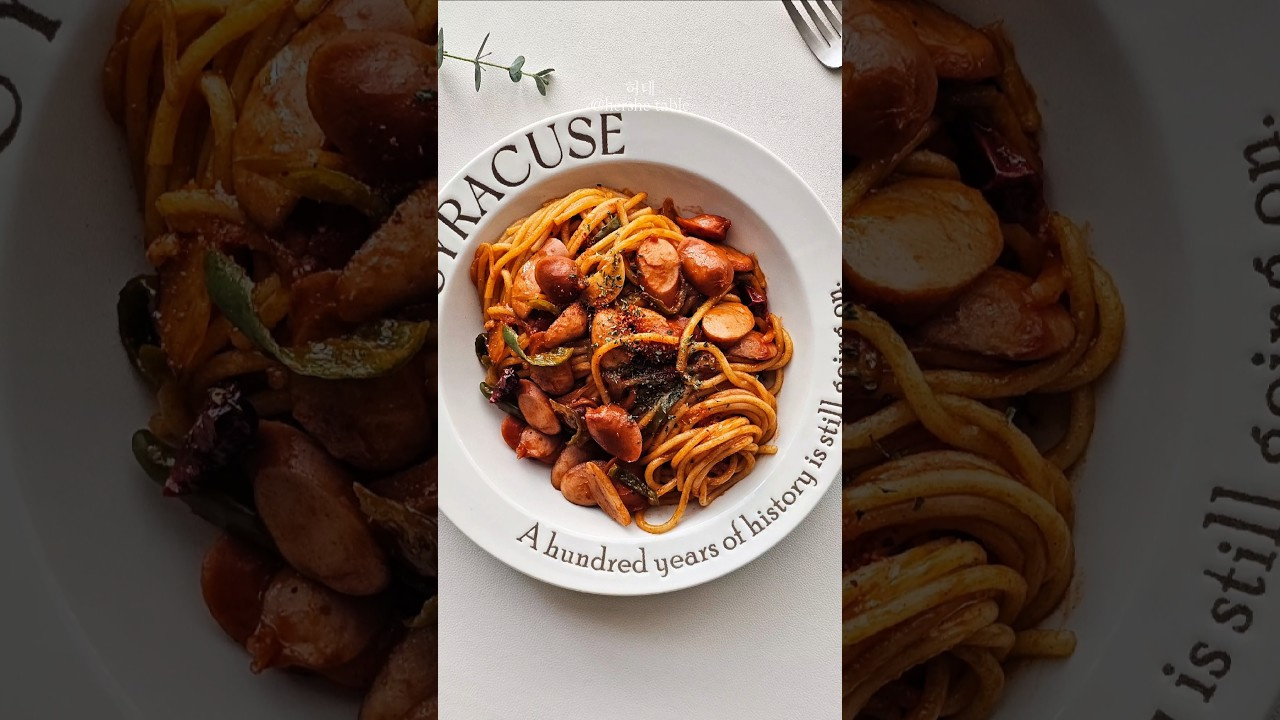 파스타면 2 인분 , 비엔나소시지 10 개 , 양파 1/2 개 , 통마늘 5 톨 , 청양고추 4 개 , 홀페퍼론치노 5 개 , 버터 2 큰술 , 토마토케첩 1 컵 , 굴소스 1 큰술 , 설탕 1 큰술 , 면수 1/2 컵 , 치킨스톡 1/2 큰술 , 올리브오일 약간 소금 약간 , 후춧가루 약간 , 파슬리가루 약간 , 이치미 약간