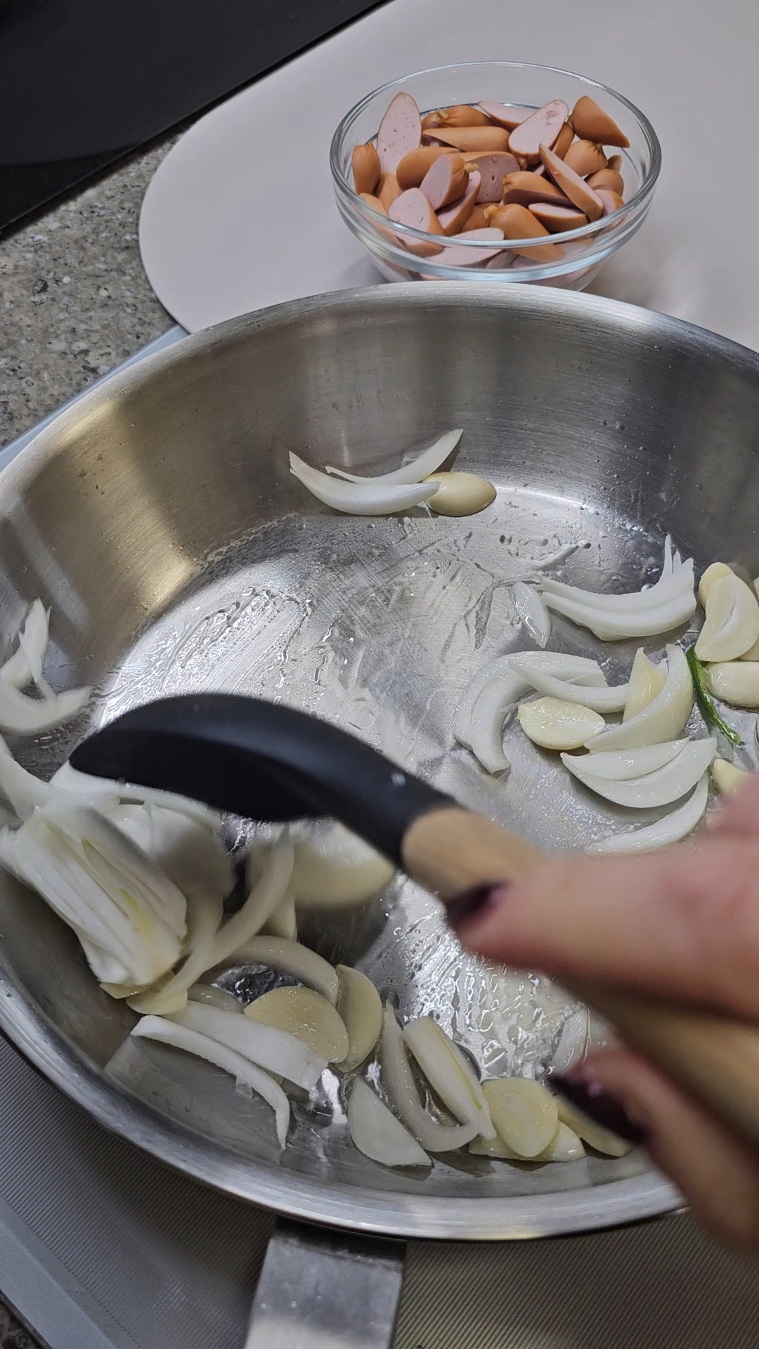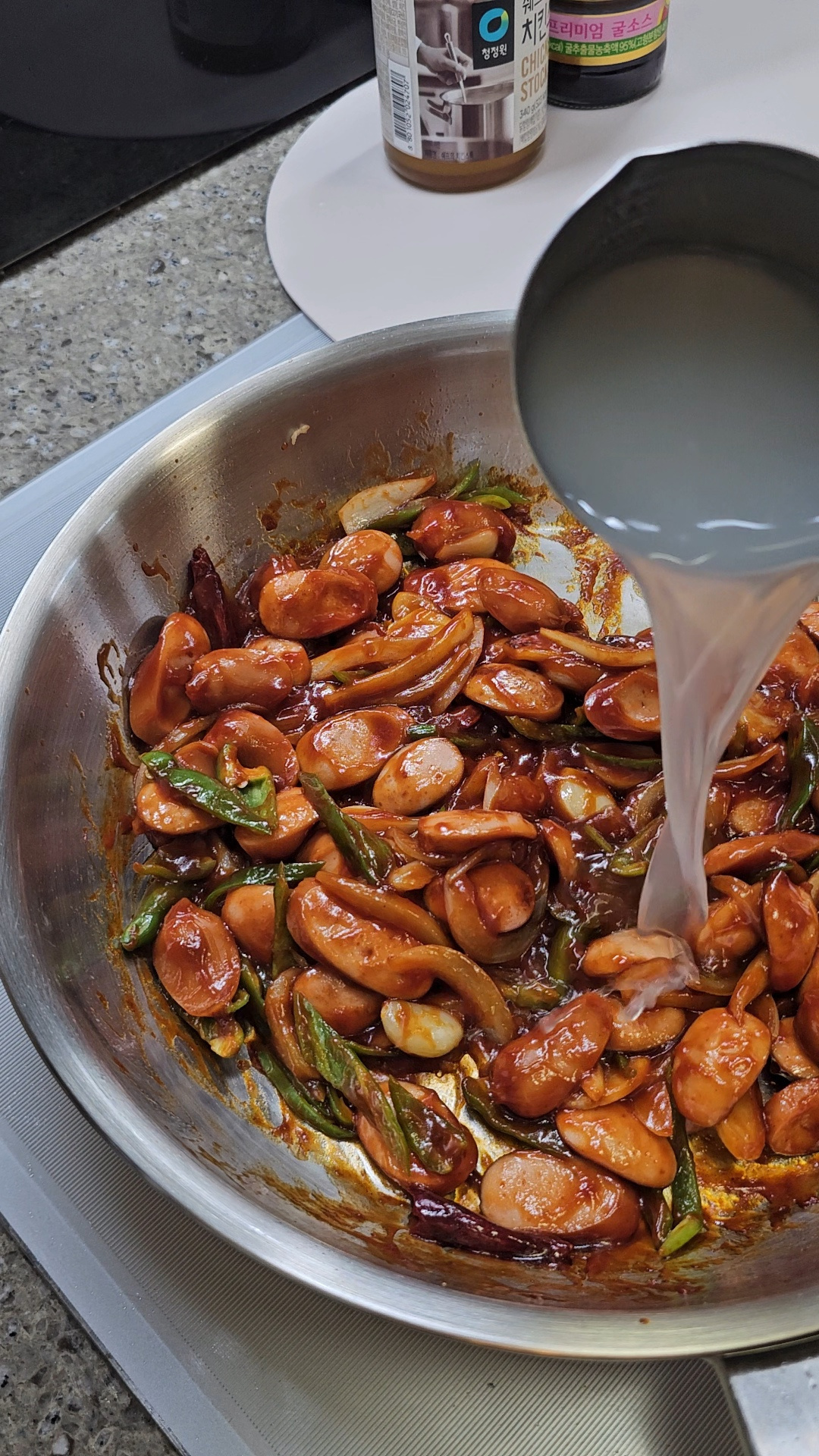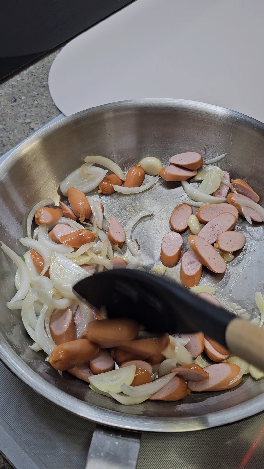 파스타면 2 인분 , 비엔나소시지 10 개 , 양파 1/2 개 , 통마늘 5 톨 , 청양고추 4 개 , 홀페퍼론치노 5 개 , 버터 2 큰술 , 토마토케첩 1 컵 , 굴소스 1 큰술 , 설탕 1 큰술 , 면수 1/2 컵 , 치킨스톡 1/2 큰술 , 올리브오일 약간 소금 약간 , 후춧가루 약간 , 파슬리가루 약간 , 이치미 약간