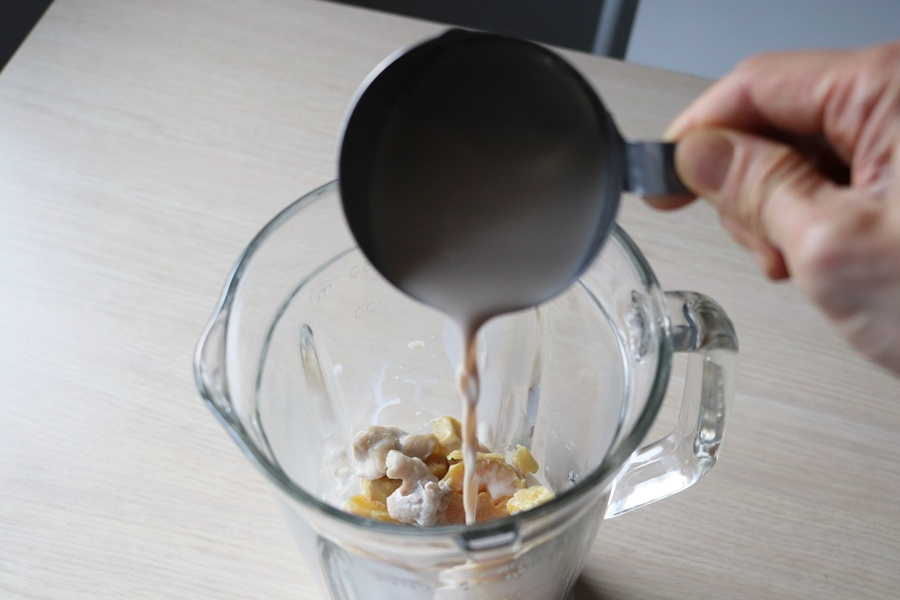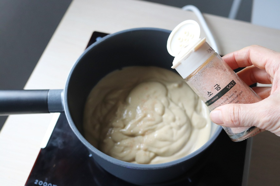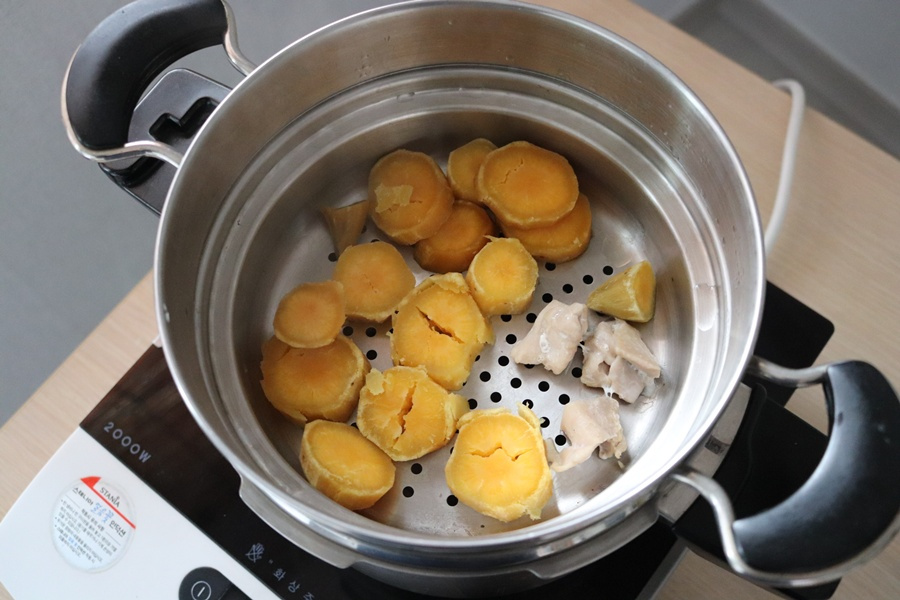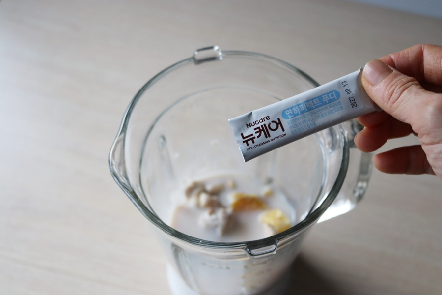 연하곤란자를 고려해 씹지 않아도 혀로 눌러 쉽게 으깨지고, 입안에서 자연스럽게 퍼진 뒤 부드럽게 삼켜질 수 있는 질감으로 설계했습니다. 고구마는 충분히 가열해 섬유질을 최소화하고, 닭안심살을 넣어 고단백 연하식으로 즐길 수 있으며 두유와 연하퍼펙트 푸디를 함께 블렌딩하여 목에 달라붙지 않는 점도를 구현했습니다. 또한 건더기가 남지 않도록 고속 블렌딩을 거쳐, 연하 시 흡인 위험을 줄이고 안정적인 섭취가 가능하도록 했습니다. 숟가락에서 끊기지 않고 부드럽게 흐르는 농도로 맞춰, 연하곤란자도 부담 없이 섭취할 수 있는 연하 친화적 메뉴입니다.