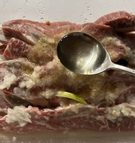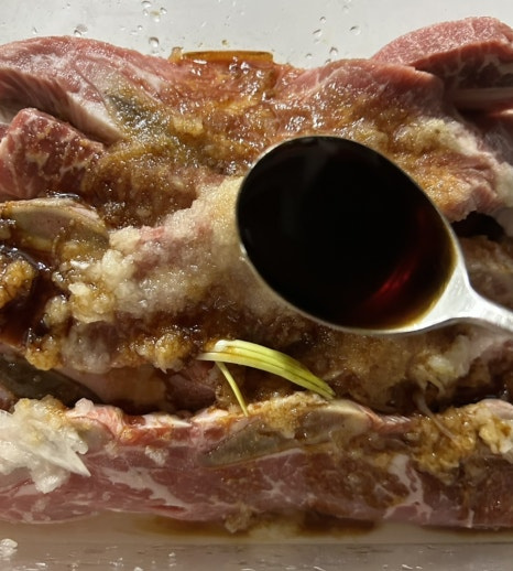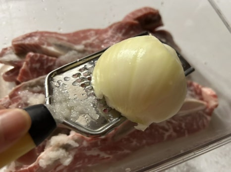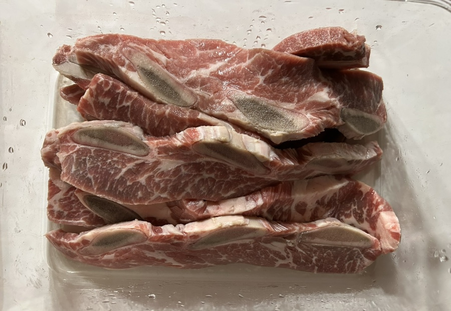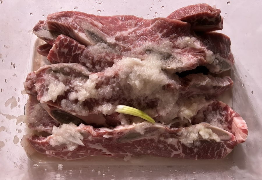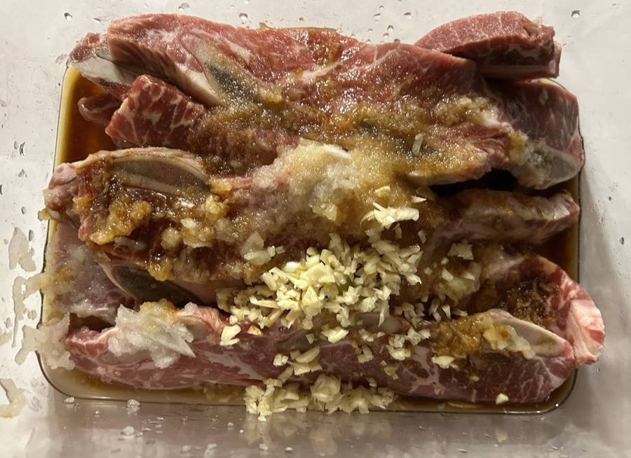 양념은 기본 갈비 양념과 같이 간장, 설탕, 맛술, 마늘 넣고 단맛과 연육 작용을 도와주기 위해 배와 양파 갈아 넣고 또 양념에 반나절 정도 재워 뒀어요.