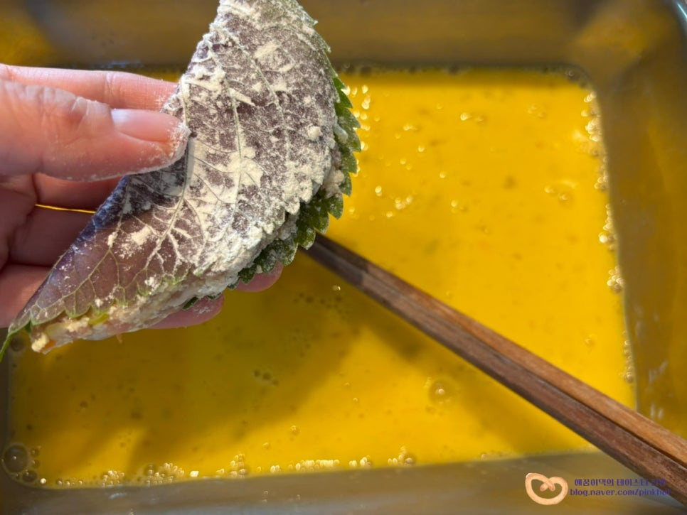 명절반찬, 제사음식을 한 번에 해결하실 수 있고요, 고소함과 향긋함이 잘 어우러져서 너무 매력적인 깻잎전이에요.깻잎에 재료를 넣고 반 접어서, 계란옷 입혀 노릇노릇 부쳐주면 완성이 되는데요.