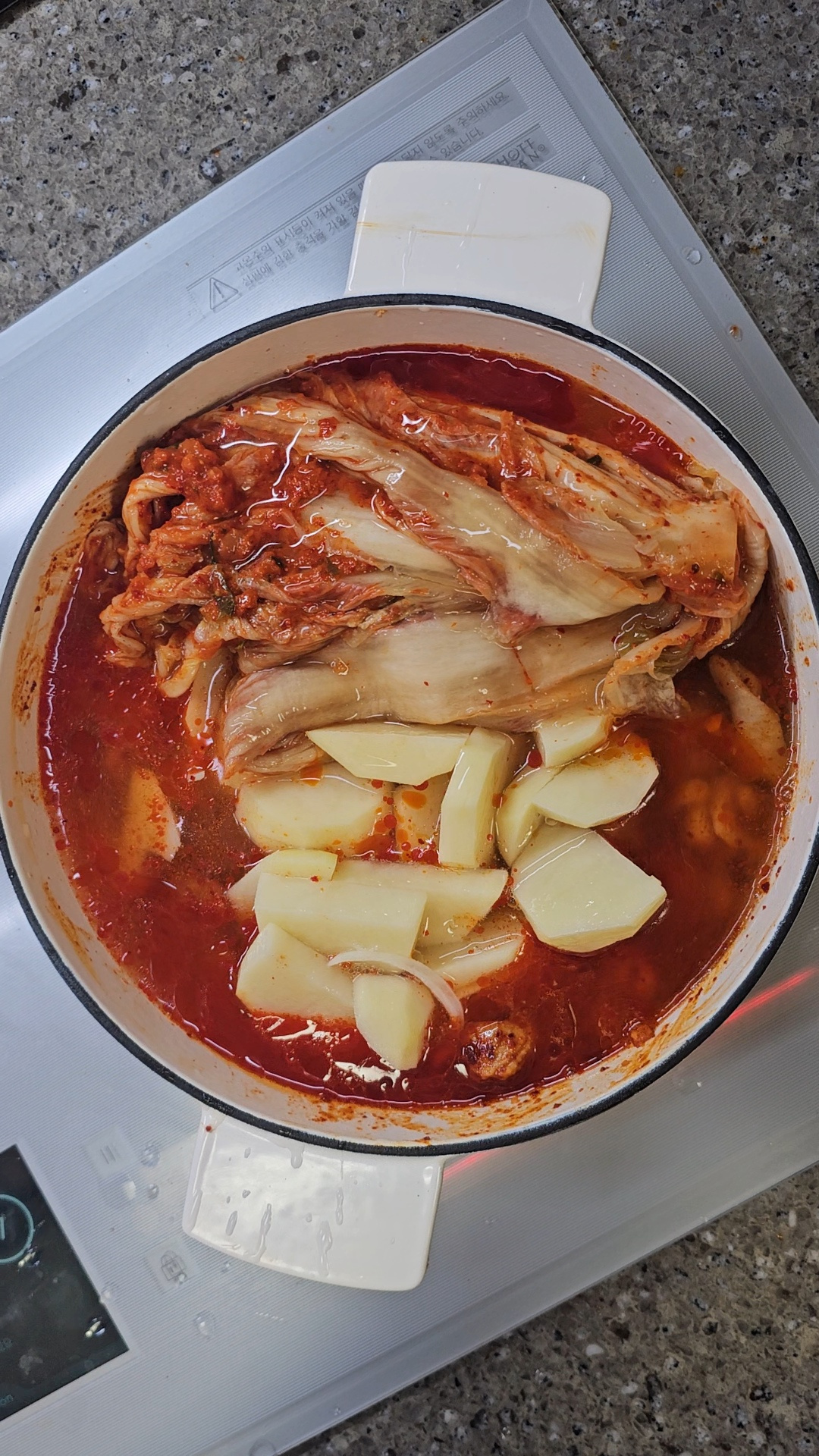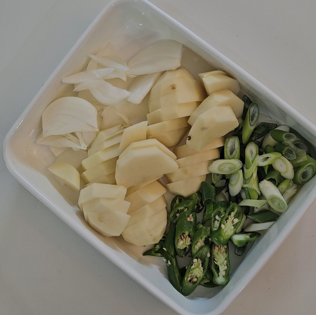 닭정육 600 g , 묵은지 1/4 포기 , 감자 3 개 , 대파 1 대 , 양파 1/2 개 , 청양고추 2 개 , 참기름 2 큰술 , 물 3 컵 , 코인육수 1 알