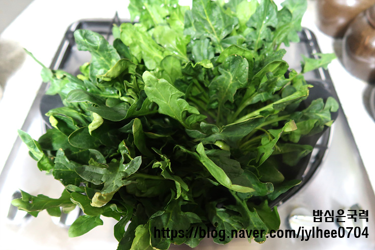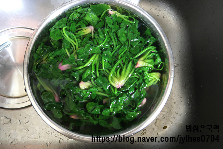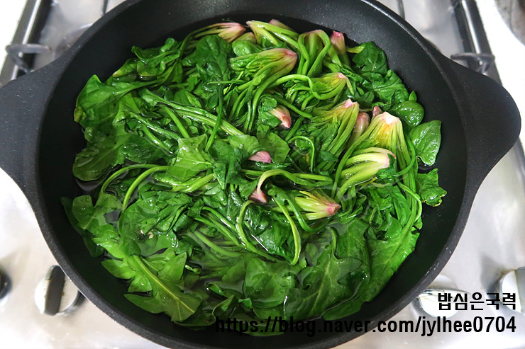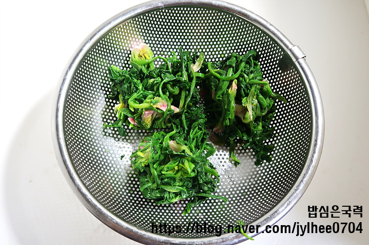이 때 뿌리 부분부터 먼저 데쳐요.