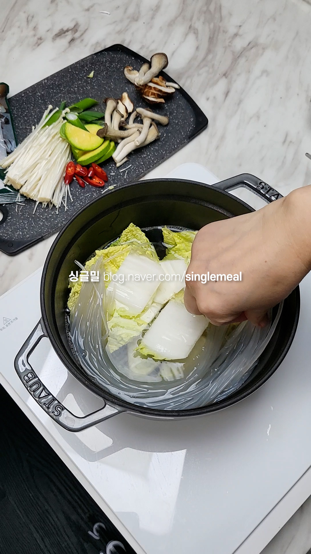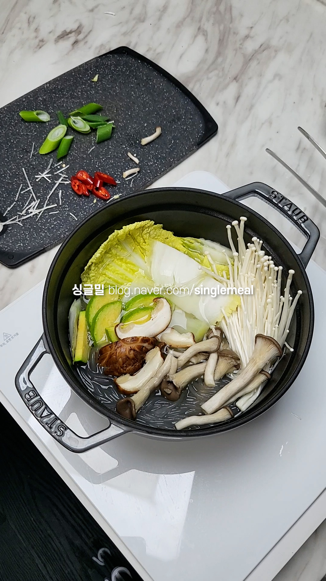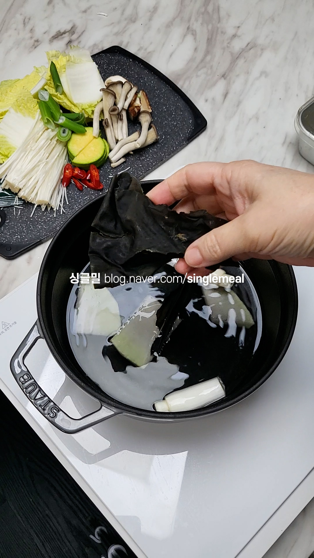 소불고기 200 g , 알배추 5 장 , 당면 60 g , 팽이버섯 60 g , 느타리버섯 , 표고버섯 1~2 개 , 애호박 50 g , 홍고추 1 개 , 대파 반 대 , 무 100 g , 다시마