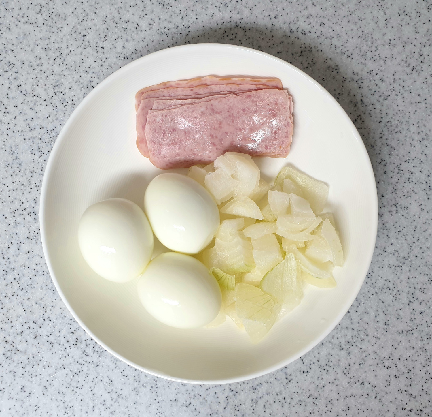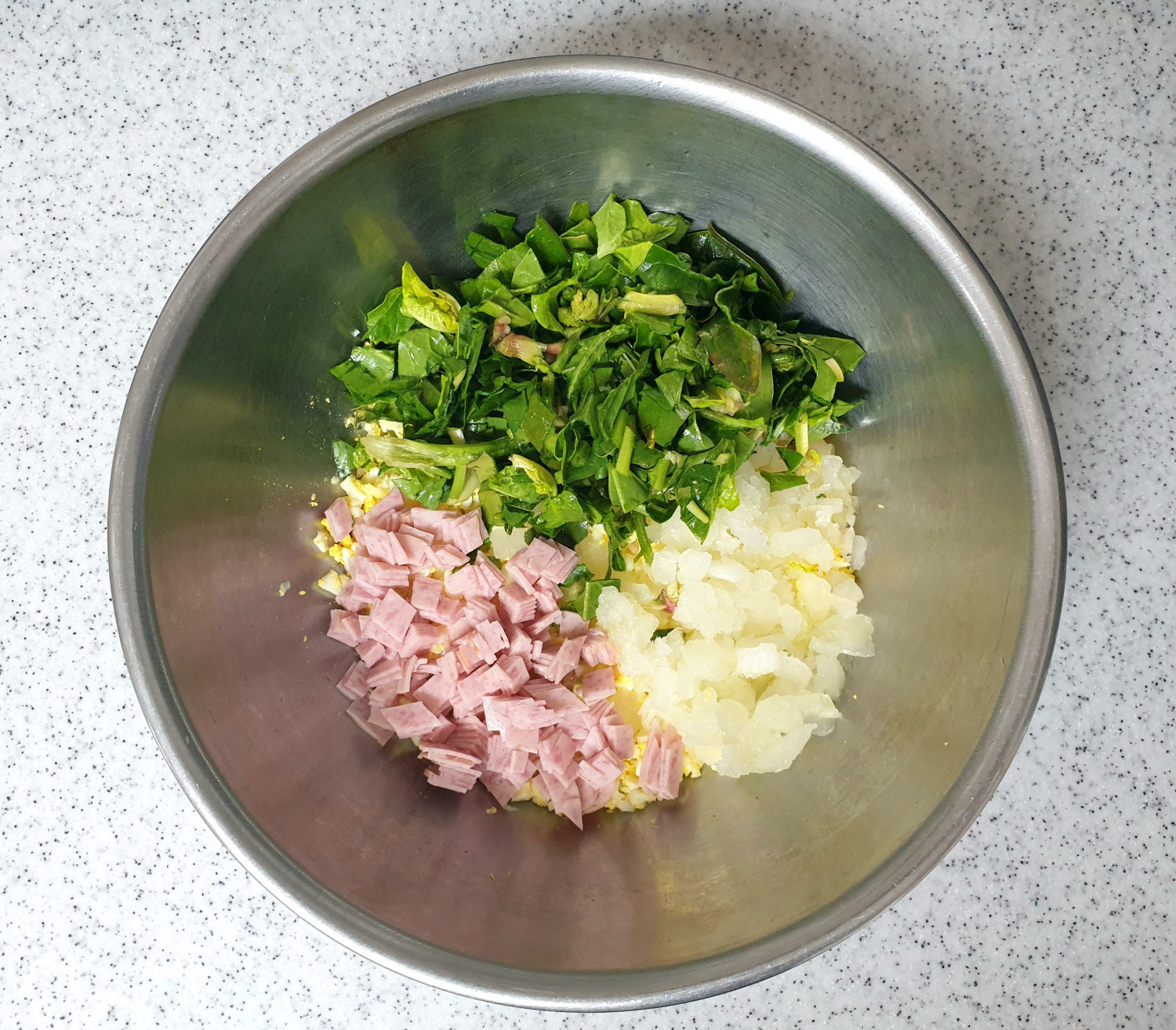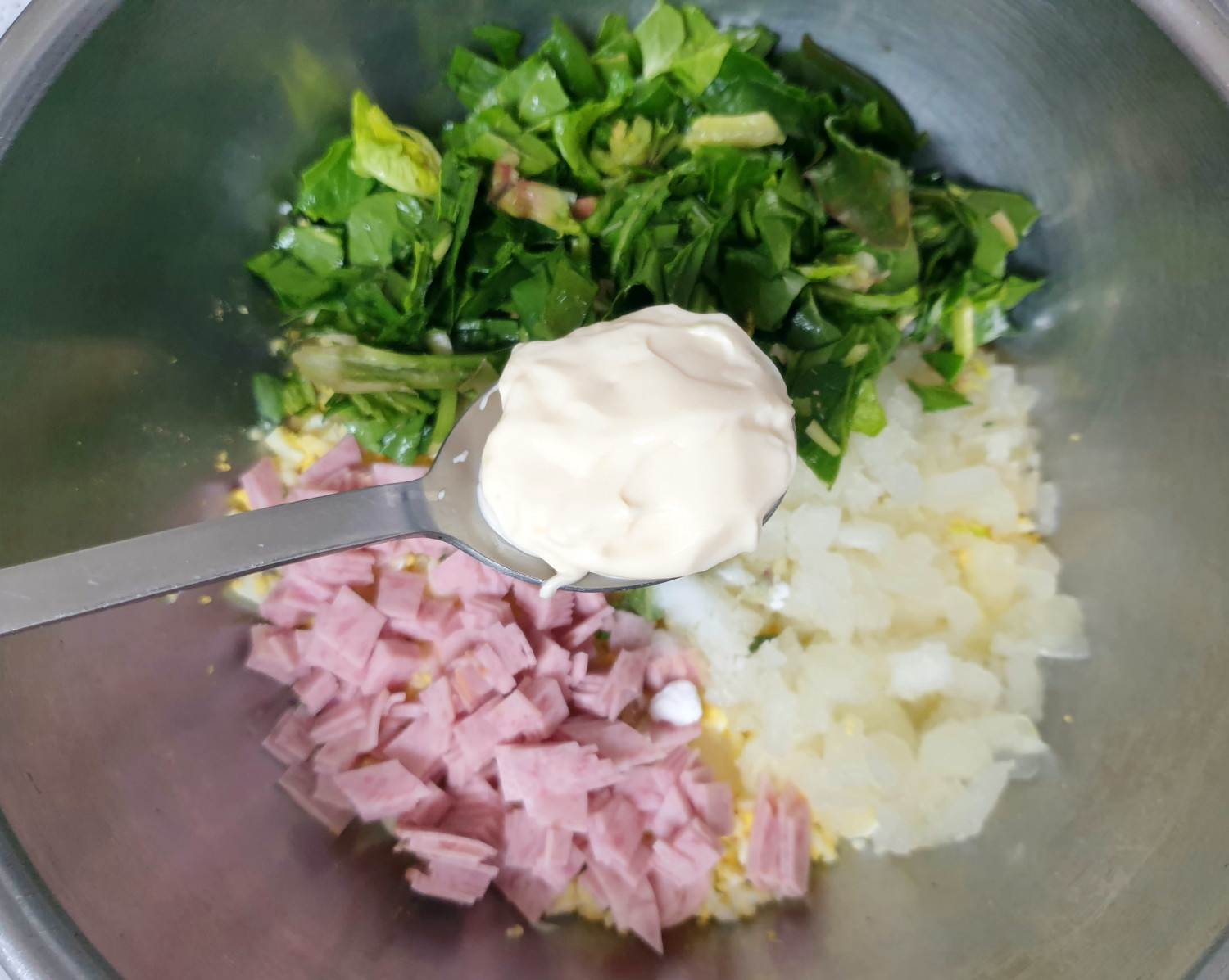 시금치 80 g , 양파 40 g , 삶은 달걀 3 개 , 슬라이스 햄 40 g , 마요네즈 3 큰술 , 설탕 1/2 큰술 , 소금 약간 , 후추 약간