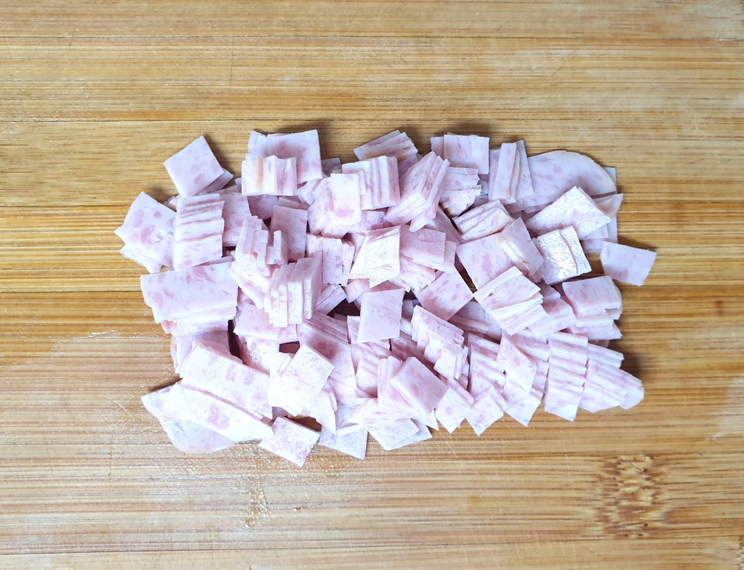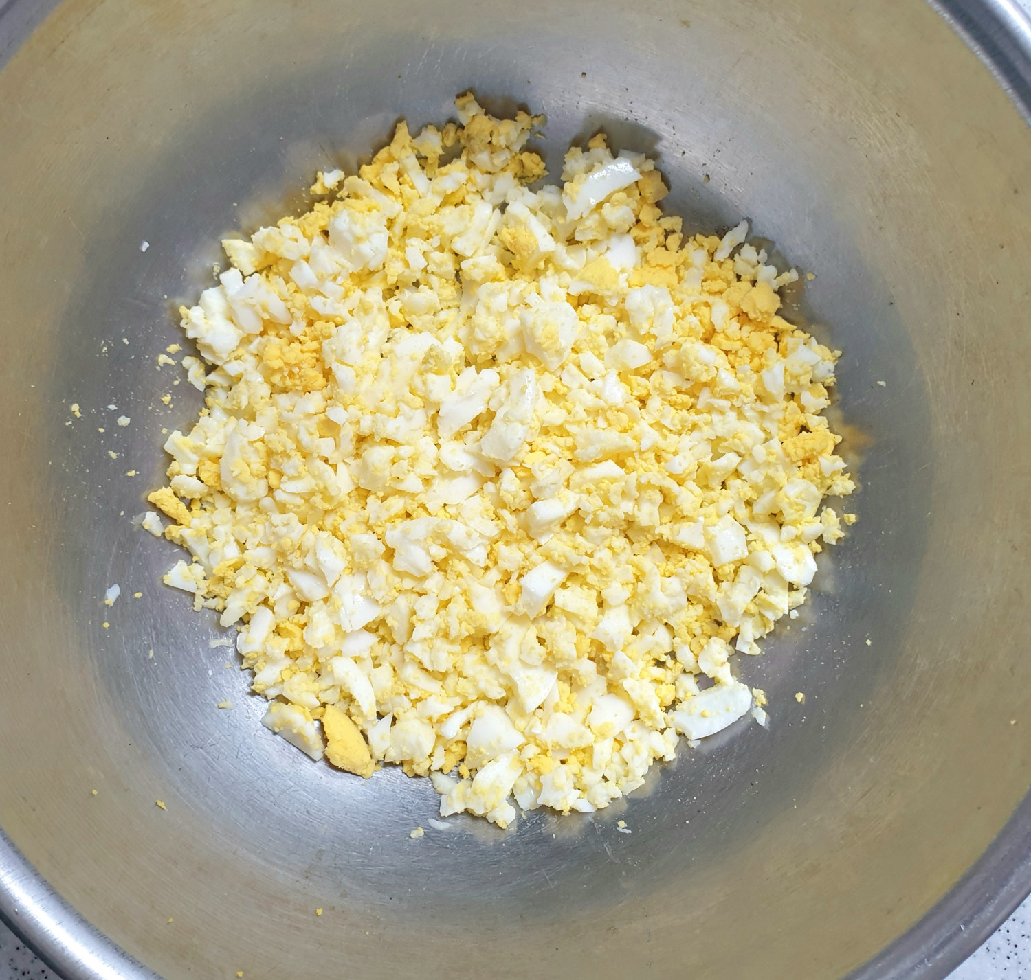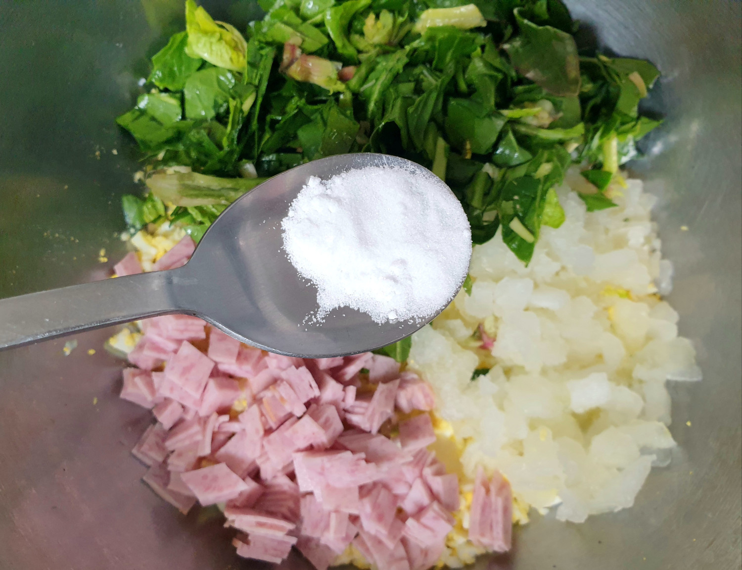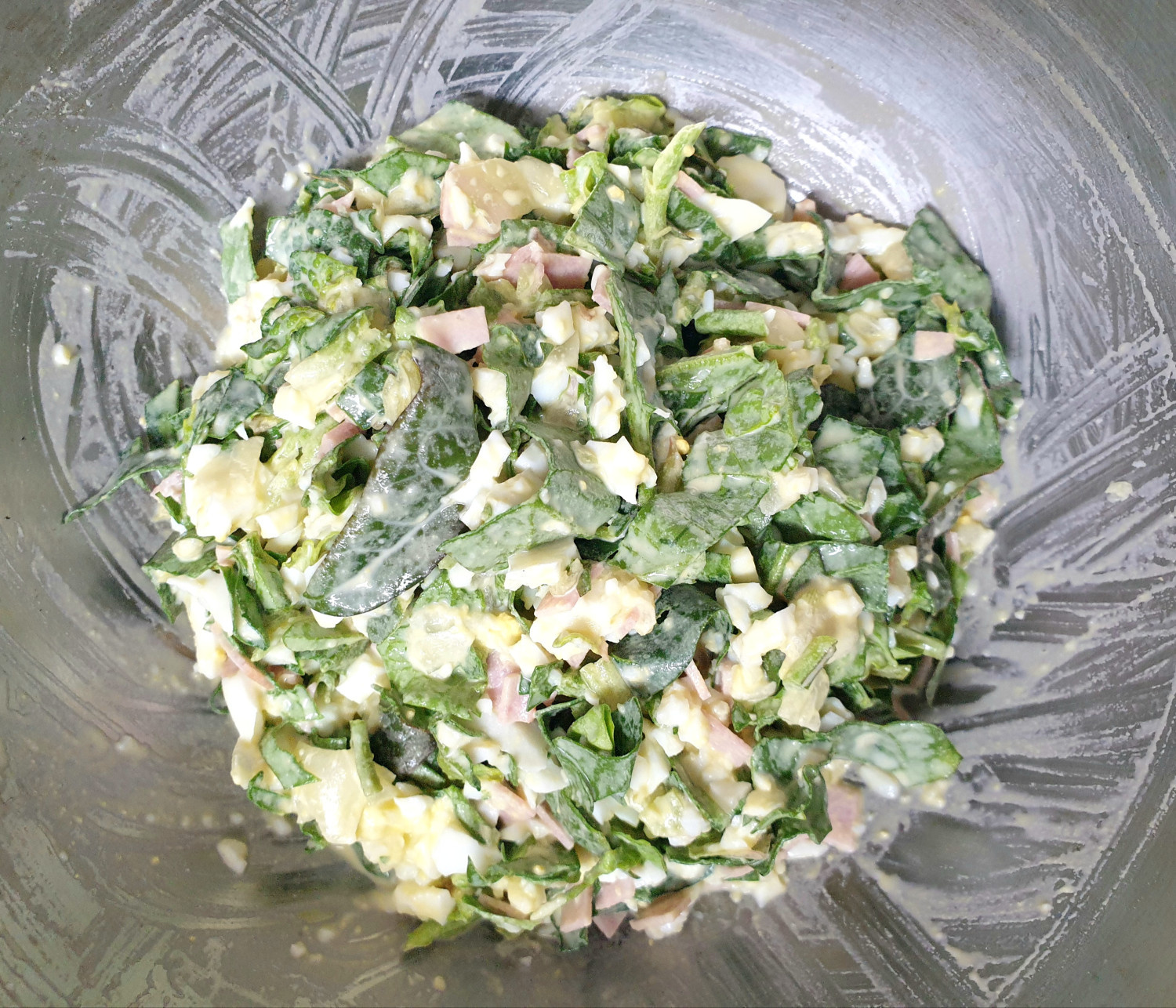 시금치 80 g , 양파 40 g , 삶은 달걀 3 개 , 슬라이스 햄 40 g , 마요네즈 3 큰술 , 설탕 1/2 큰술 , 소금 약간 , 후추 약간