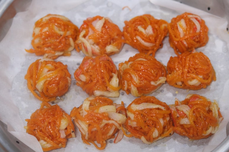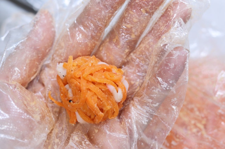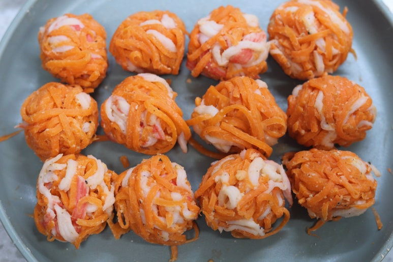당근 1개 , 크래미(1팩) 2개 , 소금 1/2스푼 , 간 참깨 1스푼 , 전분가루 3스푼