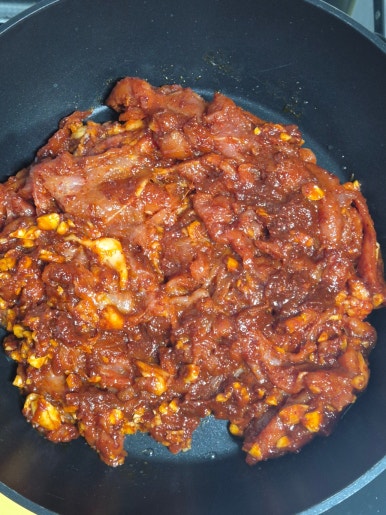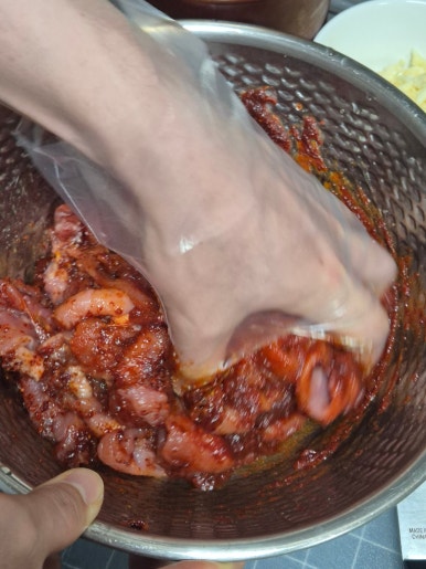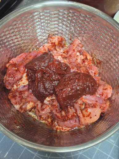 미원 한 꼬집, 후추 약간, 고춧가루 3T, 고추장 5T,