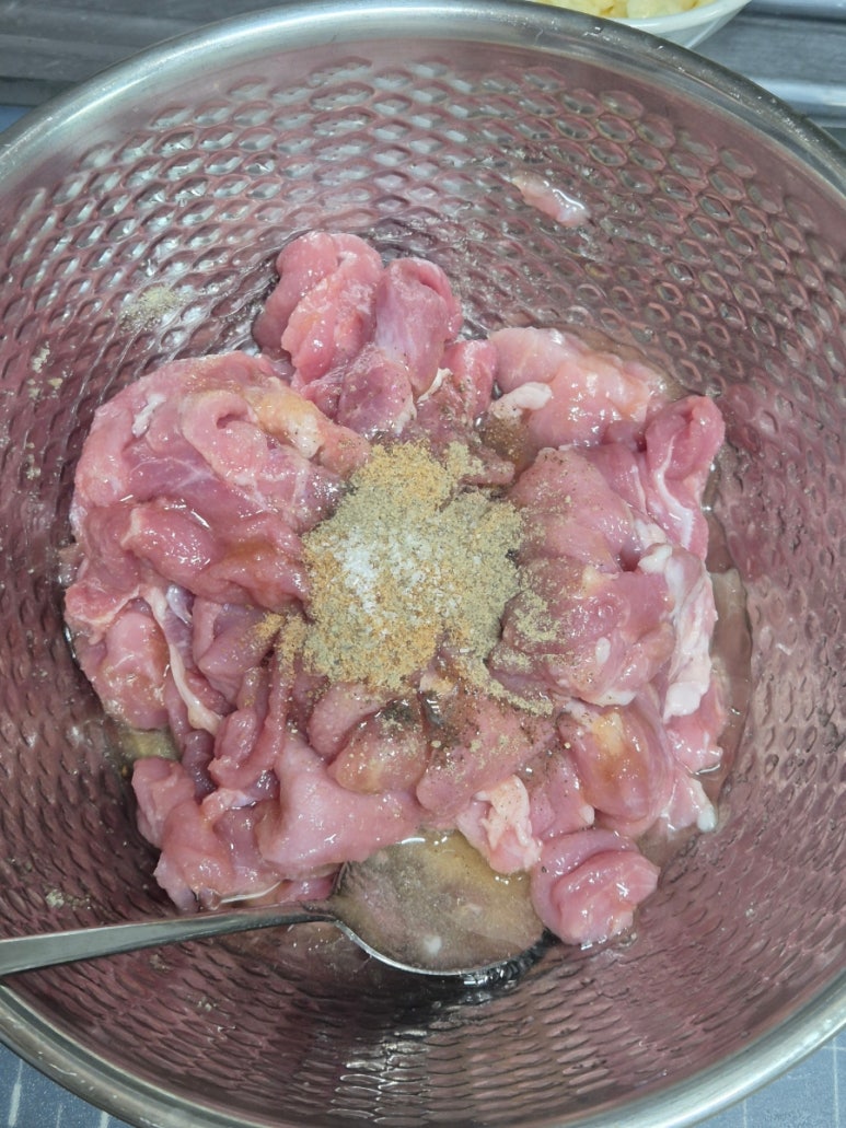 2. 큰 볼에 돼지고기 앞다리살 또는 목살 한 근을 넣고,