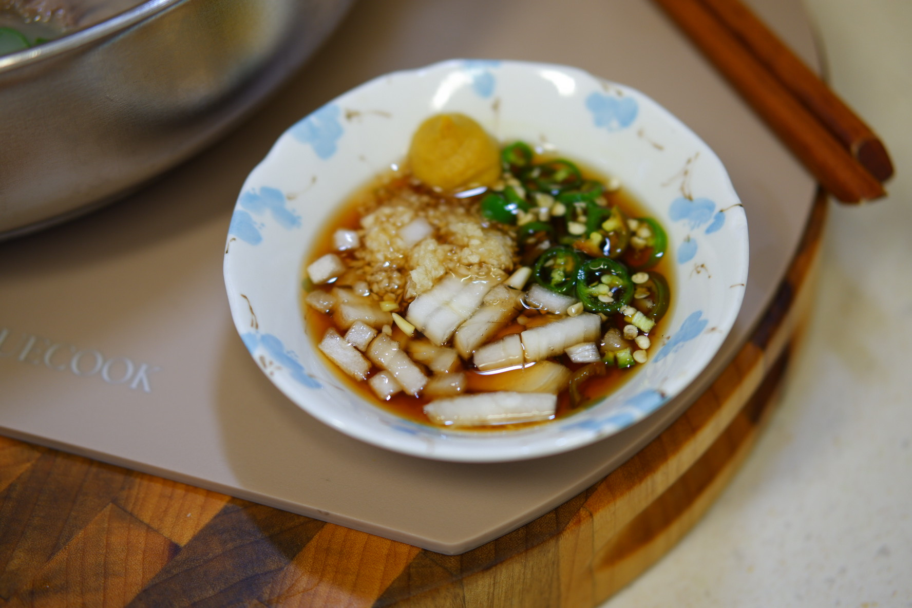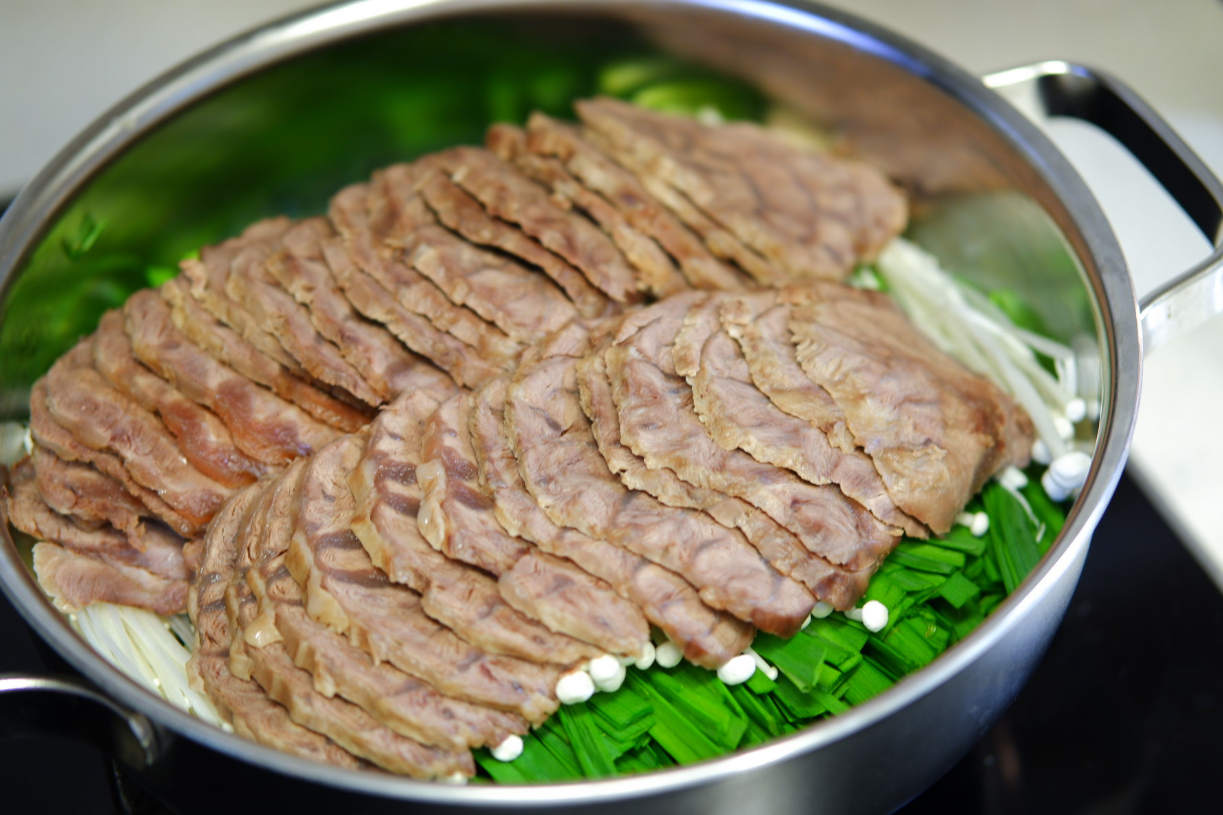 완성된 아롱사태 수육 전골은 테이블 위에서 끓여 드시면 더 맛있고, 남은 육수는 다음 날 떡국 육수로 활용해도 좋아요.