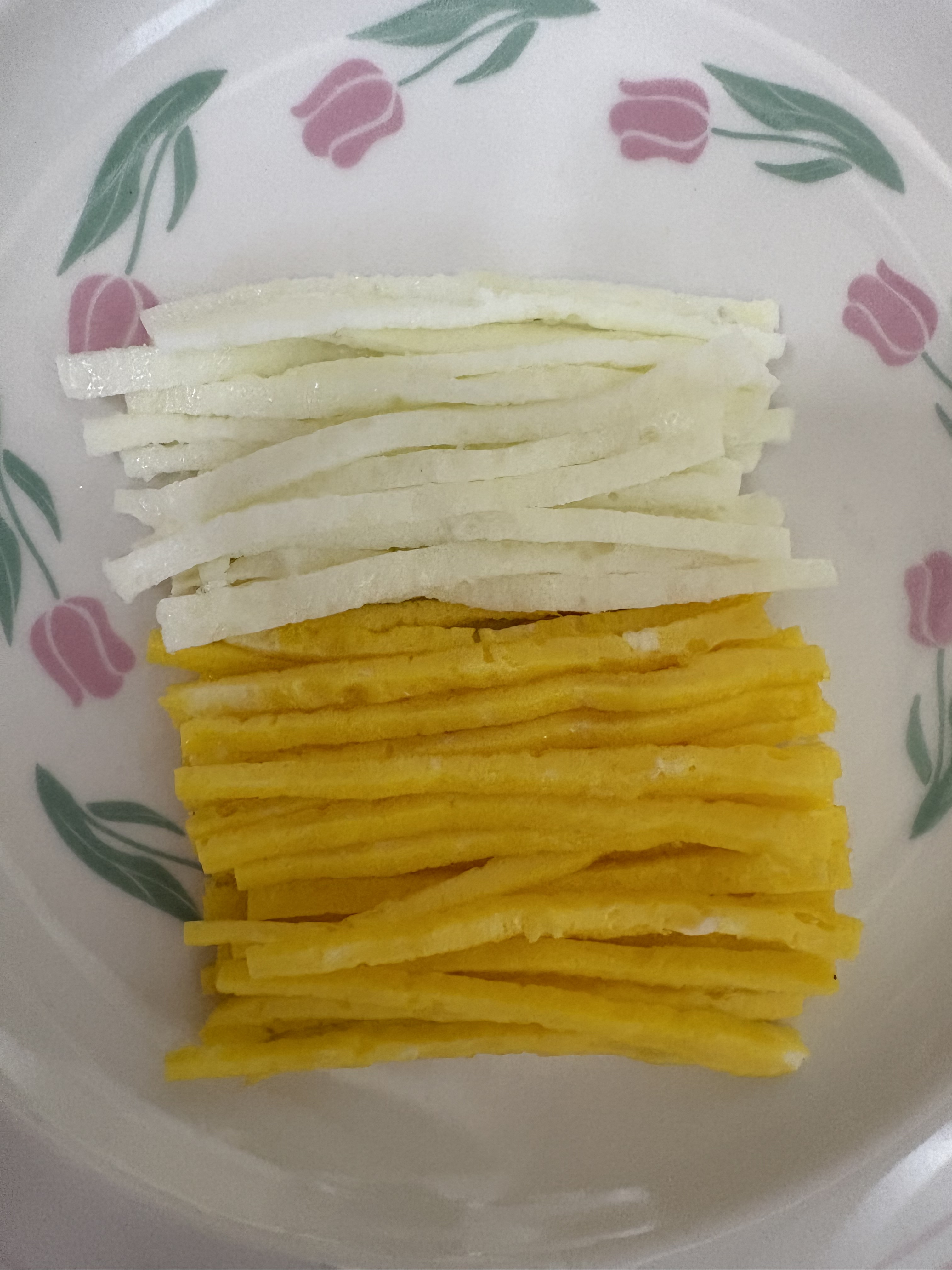 계란물은 팬을 살짝 기울여 얇게 퍼지게 부쳐야 채 썰었을 때 모양이 예뻐요.