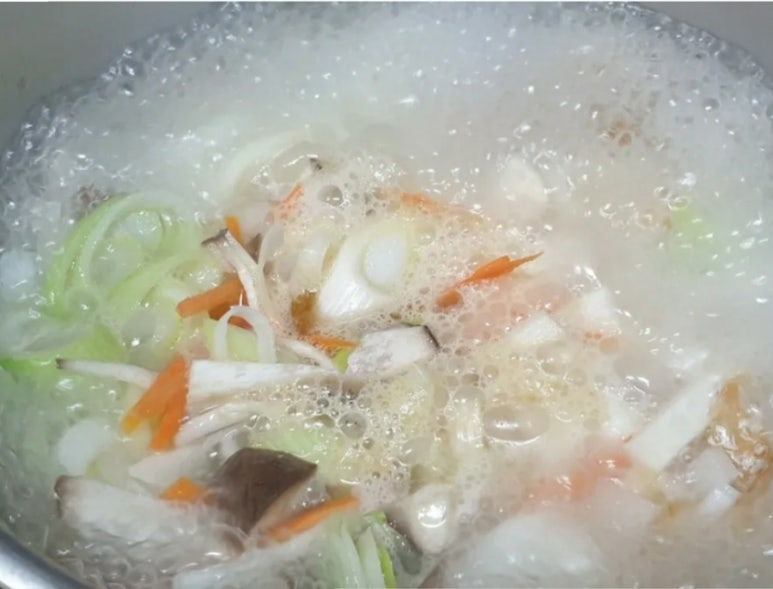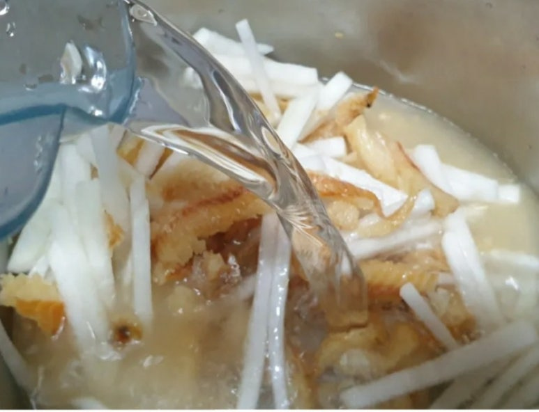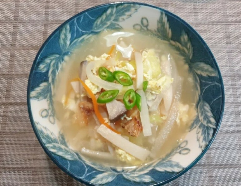 북어 두 줌 , 무 1/4 , 대파 1 , 새송이버섯 , 계란 2 , 청양고추 1 , 당근 (생략가능) , 물 1.2리터