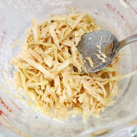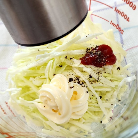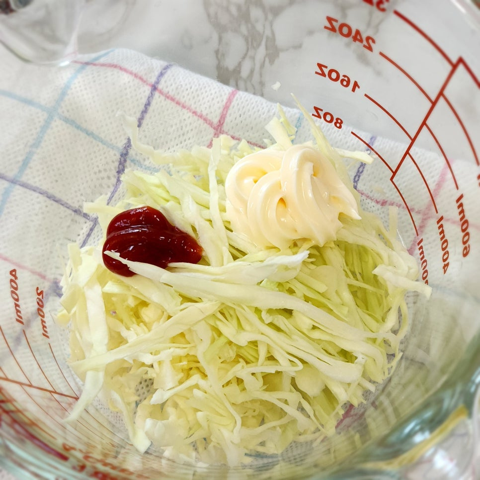 채 썬 양배추에 마요네즈 1 큰술과 케첩 1/2 큰술을 넣고