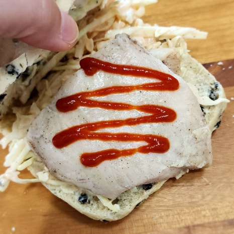 위에 닭가슴살을 올린 다음 매콤함을 추가하기 위해 스리라차 소스를 뿌려 주었답니다