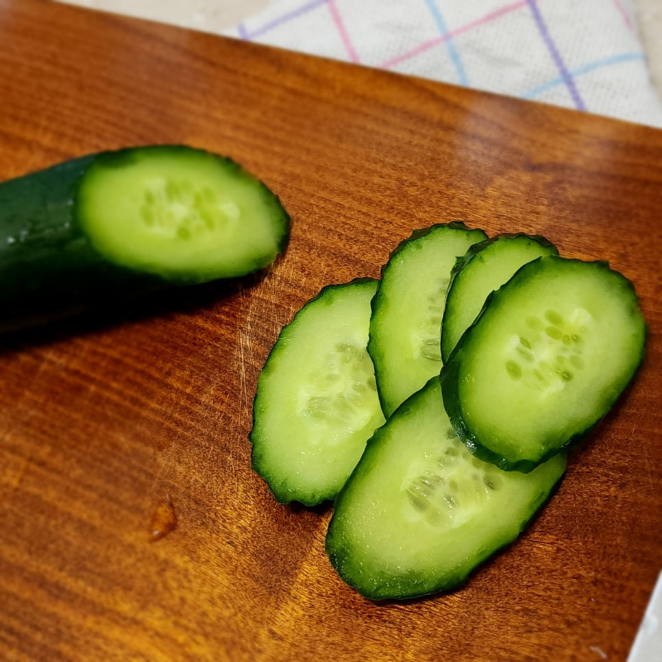 오이의 가시는 굵은소금으로 문질러서 깨끗이 제거한 다음 얇게 슬라이스해 주었답니다