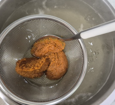 ✔️된장을 체에 걸러 풀어주면 국물이 한층 더 깔끔해져요.