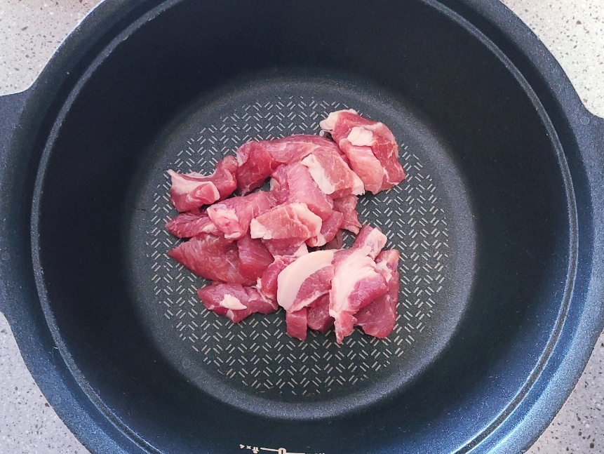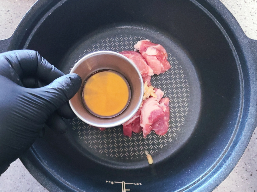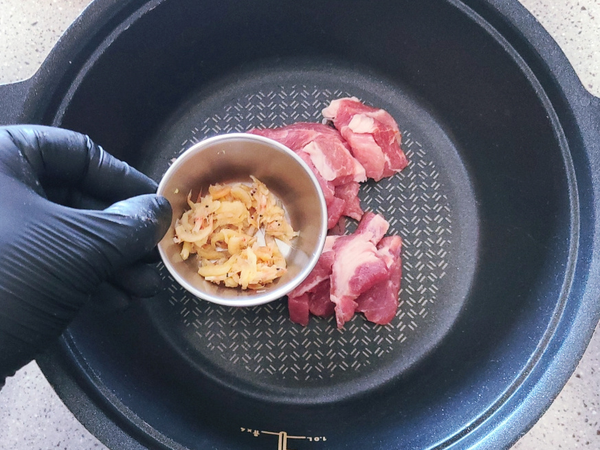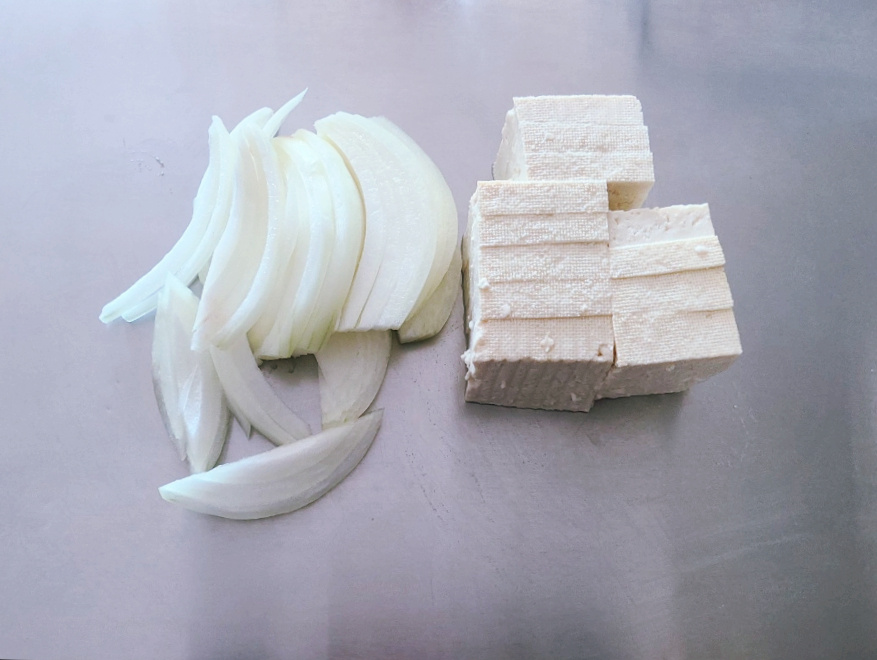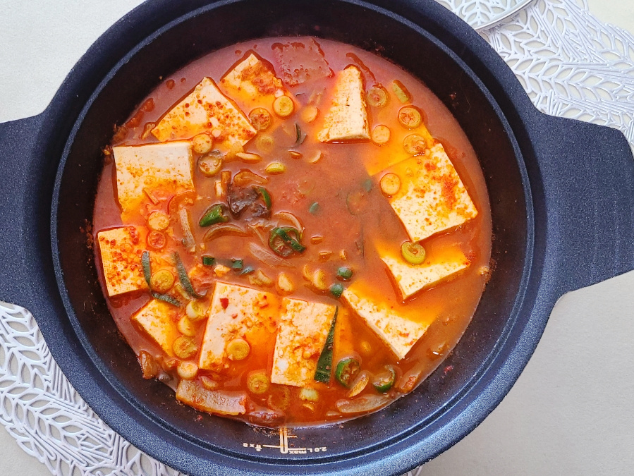 돼지고기 130 g (목살), 묵은지 170 g , 두부 270 g , 양파 115 g , 대파 20 g , 청양고추 1 개 , 다진마늘 1 큰술 , 새우젓 1 큰술 , 고춧가루 2 큰술 , 국간장 0.5 큰술 , 참기름 1 큰술 , 사골육수 1봉지 500 g , 물 100 ml