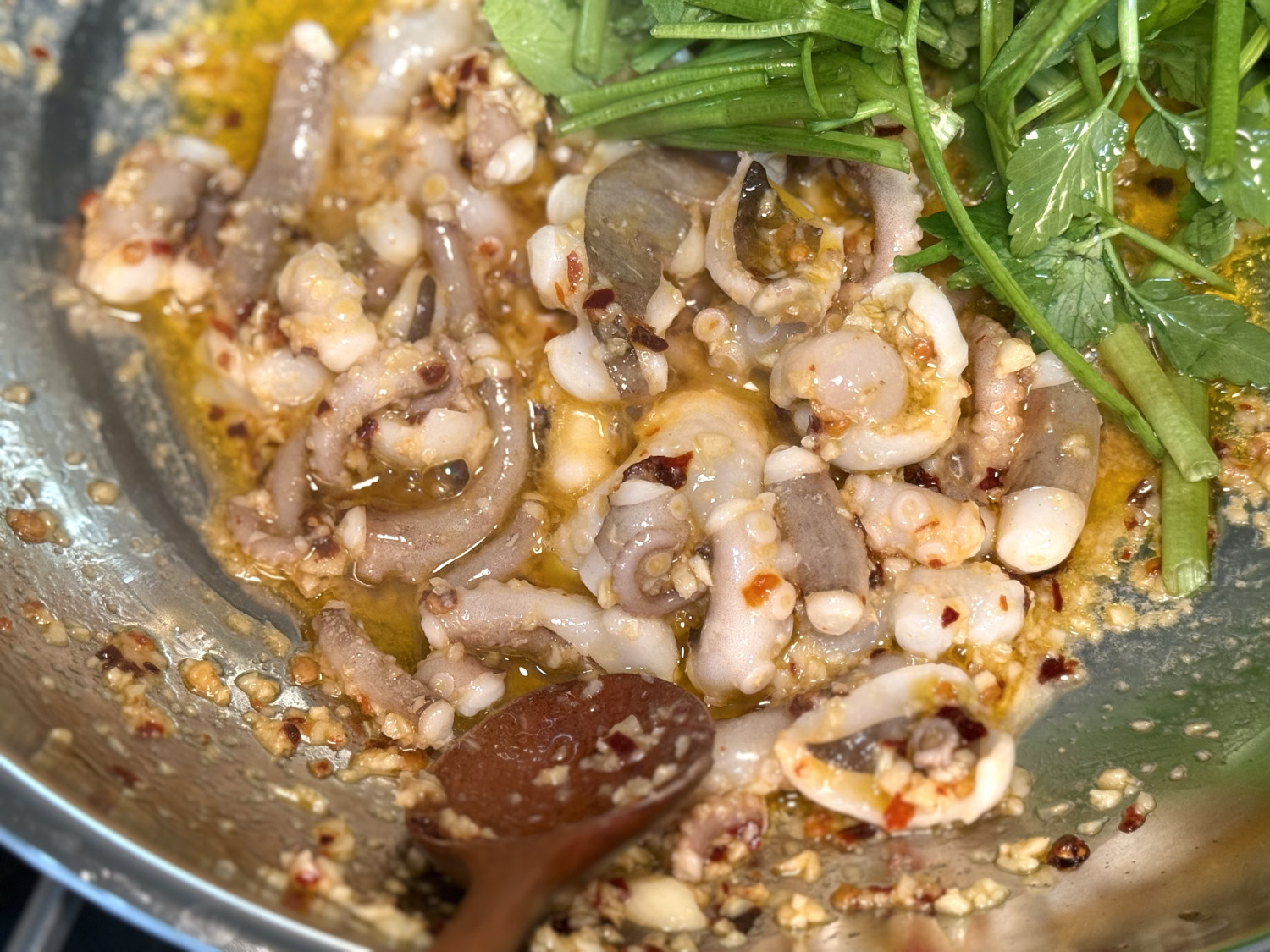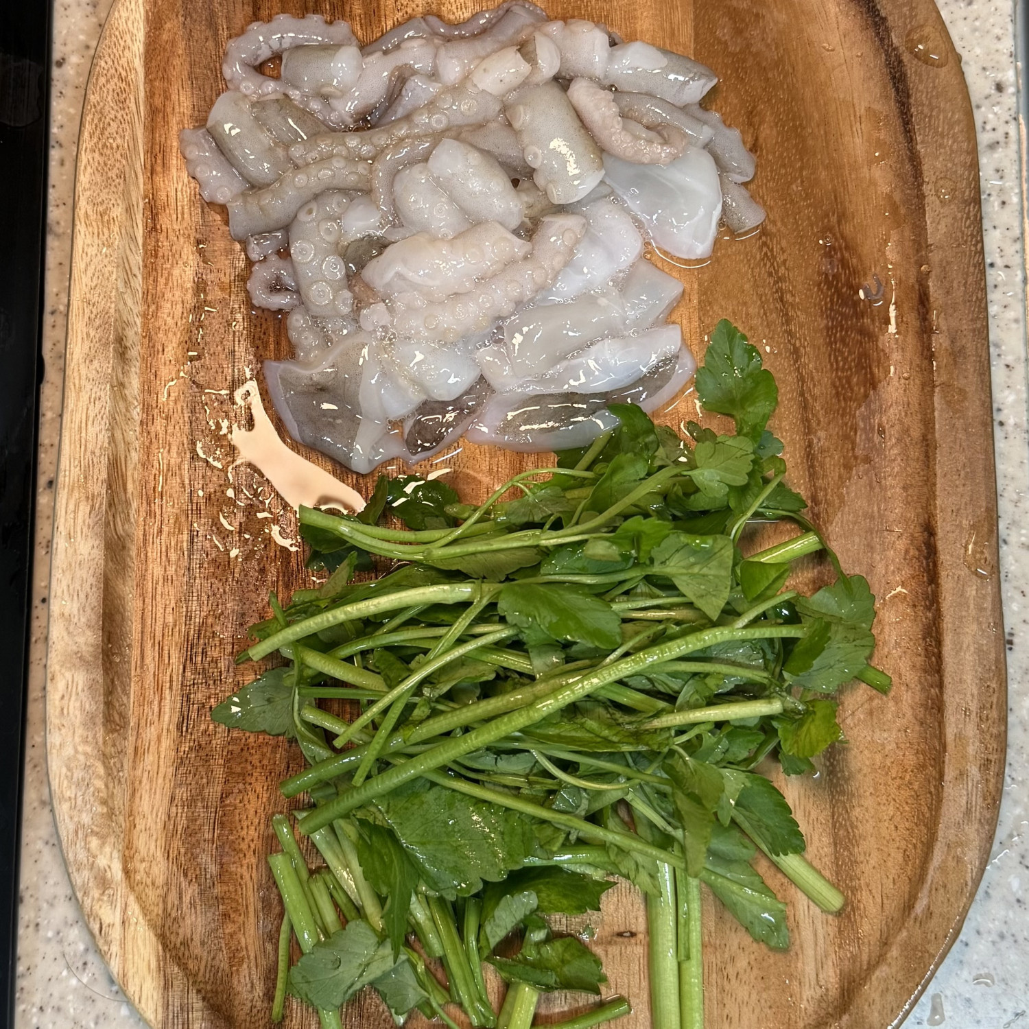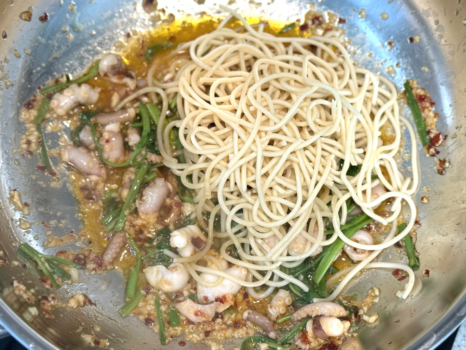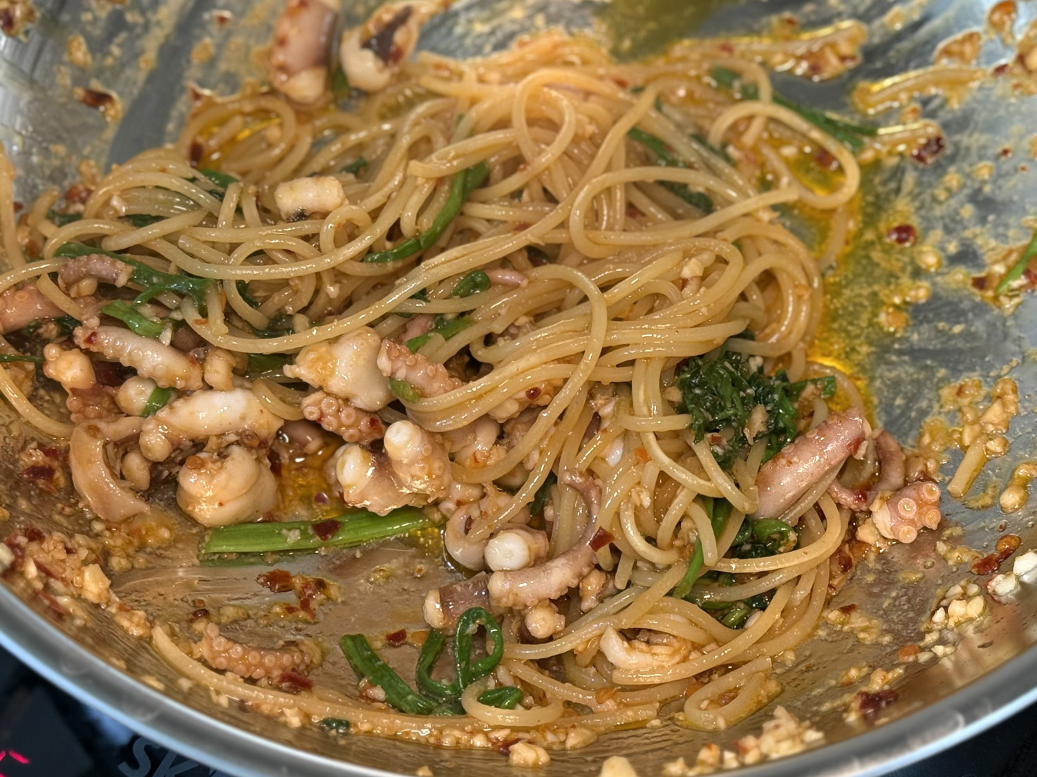 냉동 낙지 2 마리 , 미나리 , 파스타면 1 인분 , 올리브오일 , 다진마늘 1 스푼 , 레드 페퍼론치노 2 스푼 , 굴소스 1 스푼