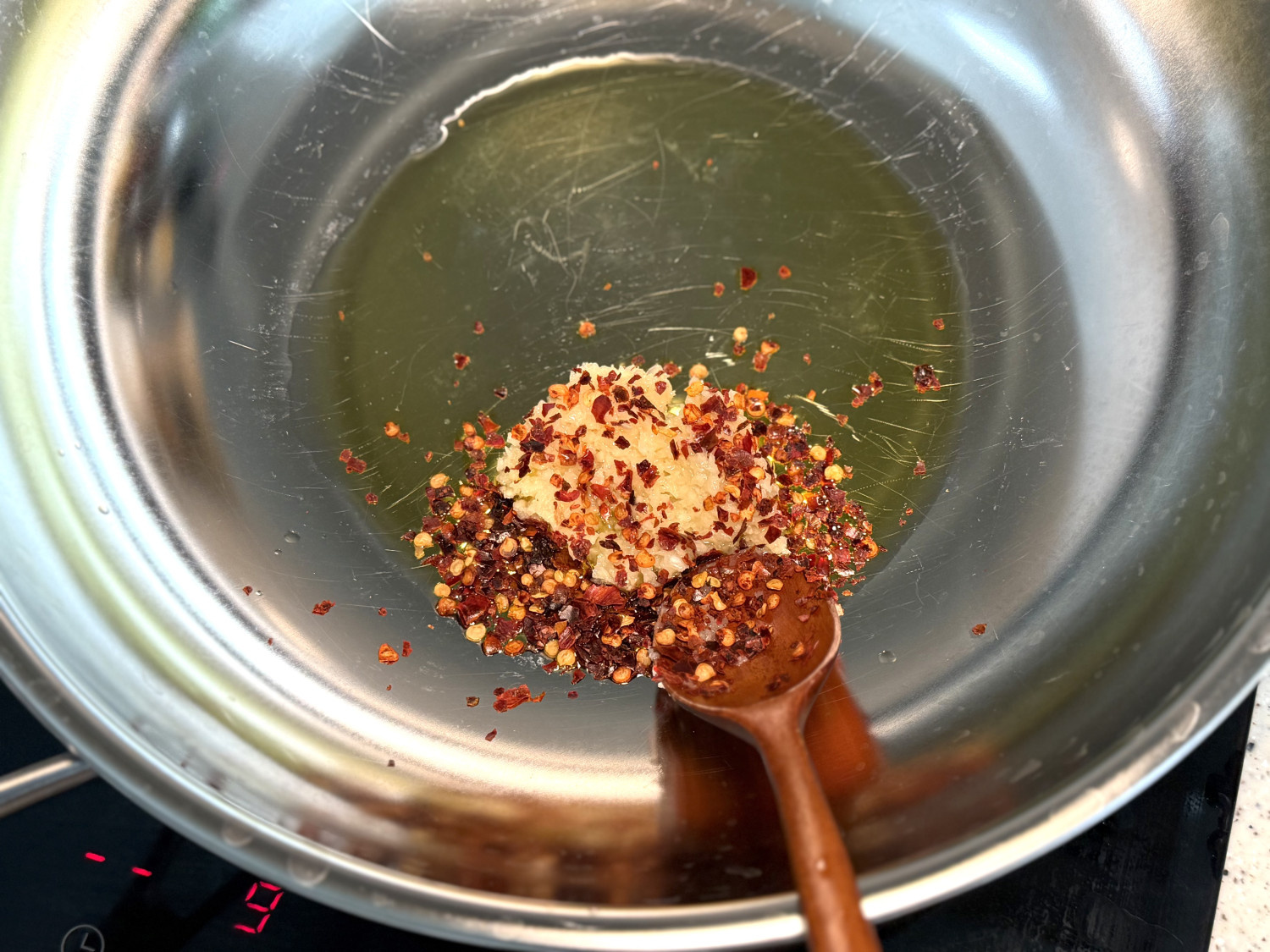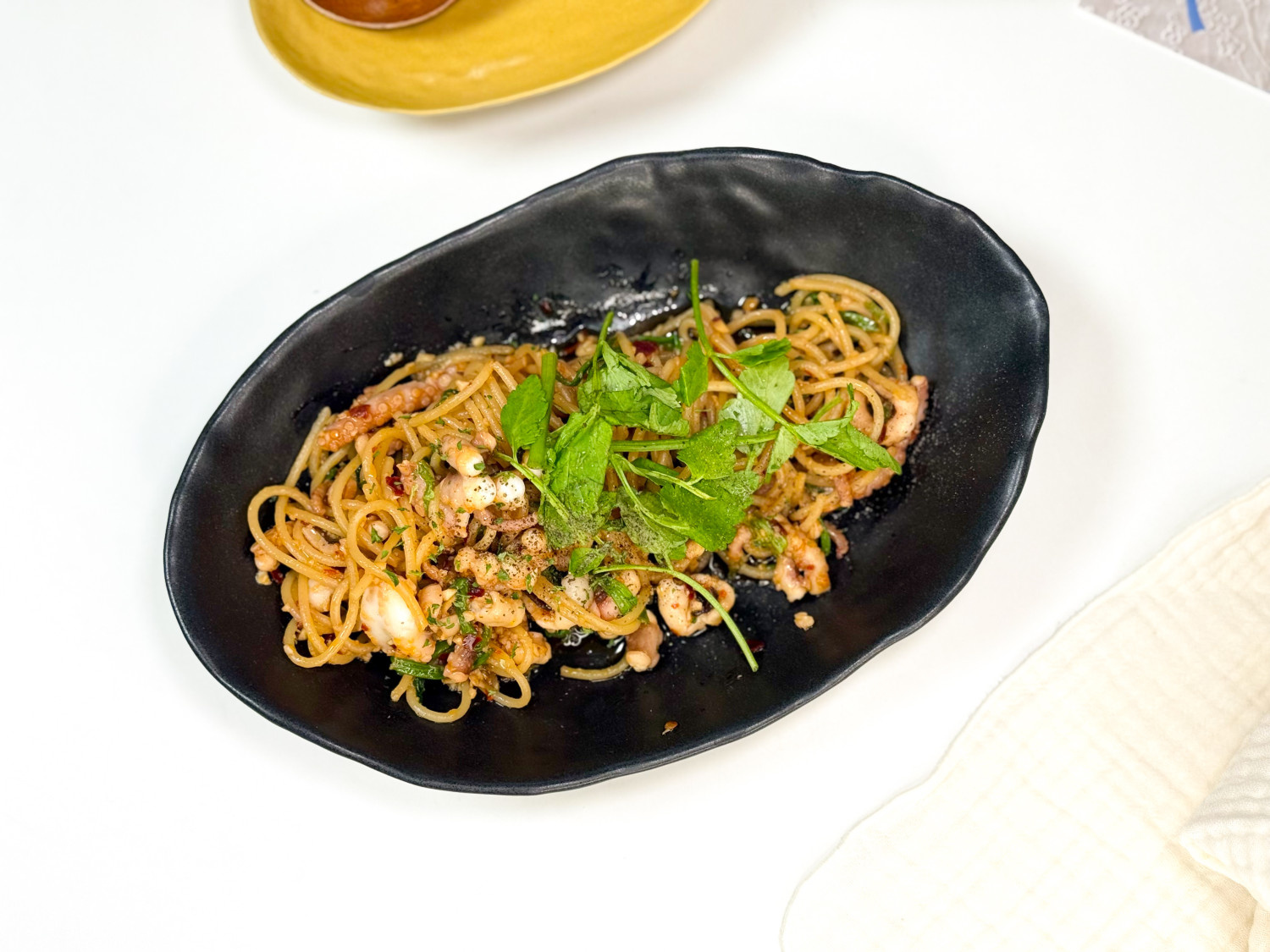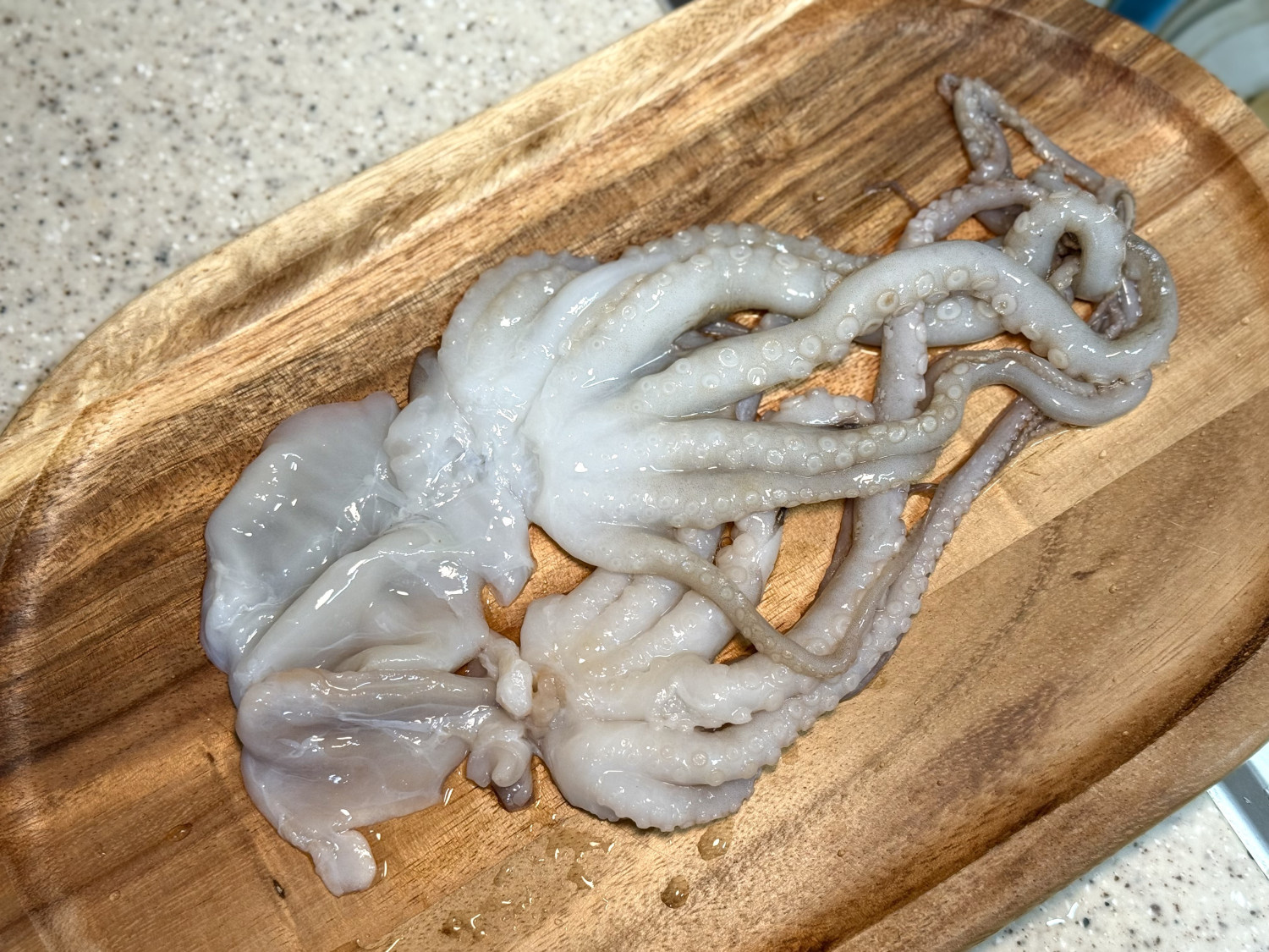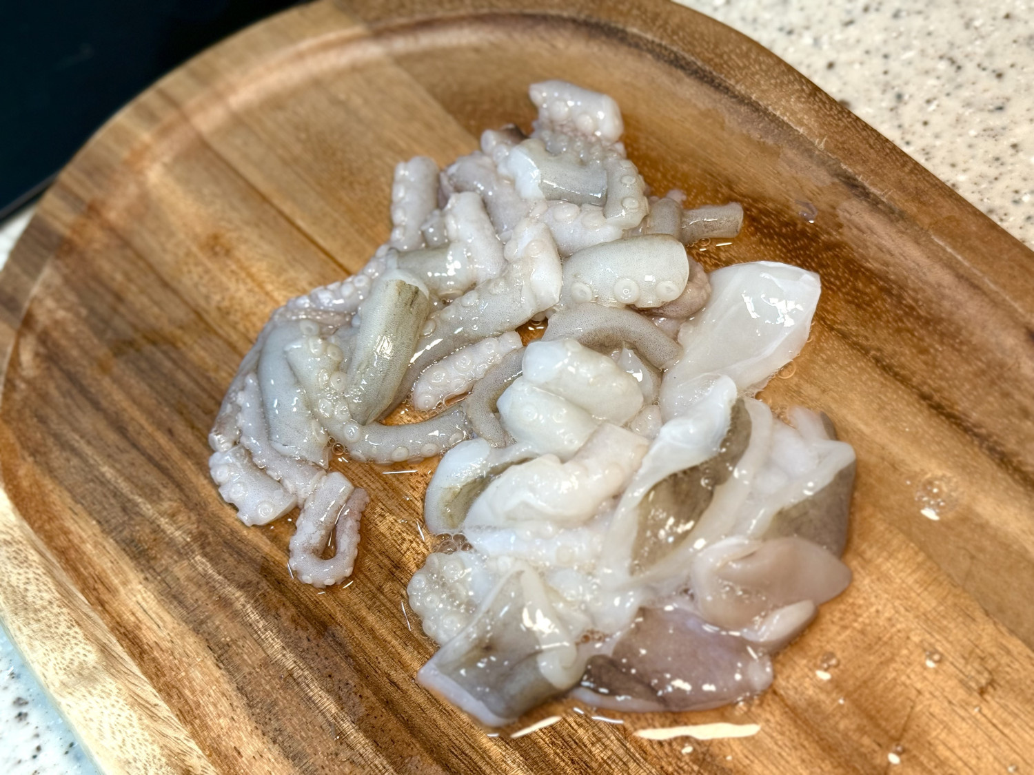 냉동 낙지 2 마리 , 미나리 , 파스타면 1 인분 , 올리브오일 , 다진마늘 1 스푼 , 레드 페퍼론치노 2 스푼 , 굴소스 1 스푼
