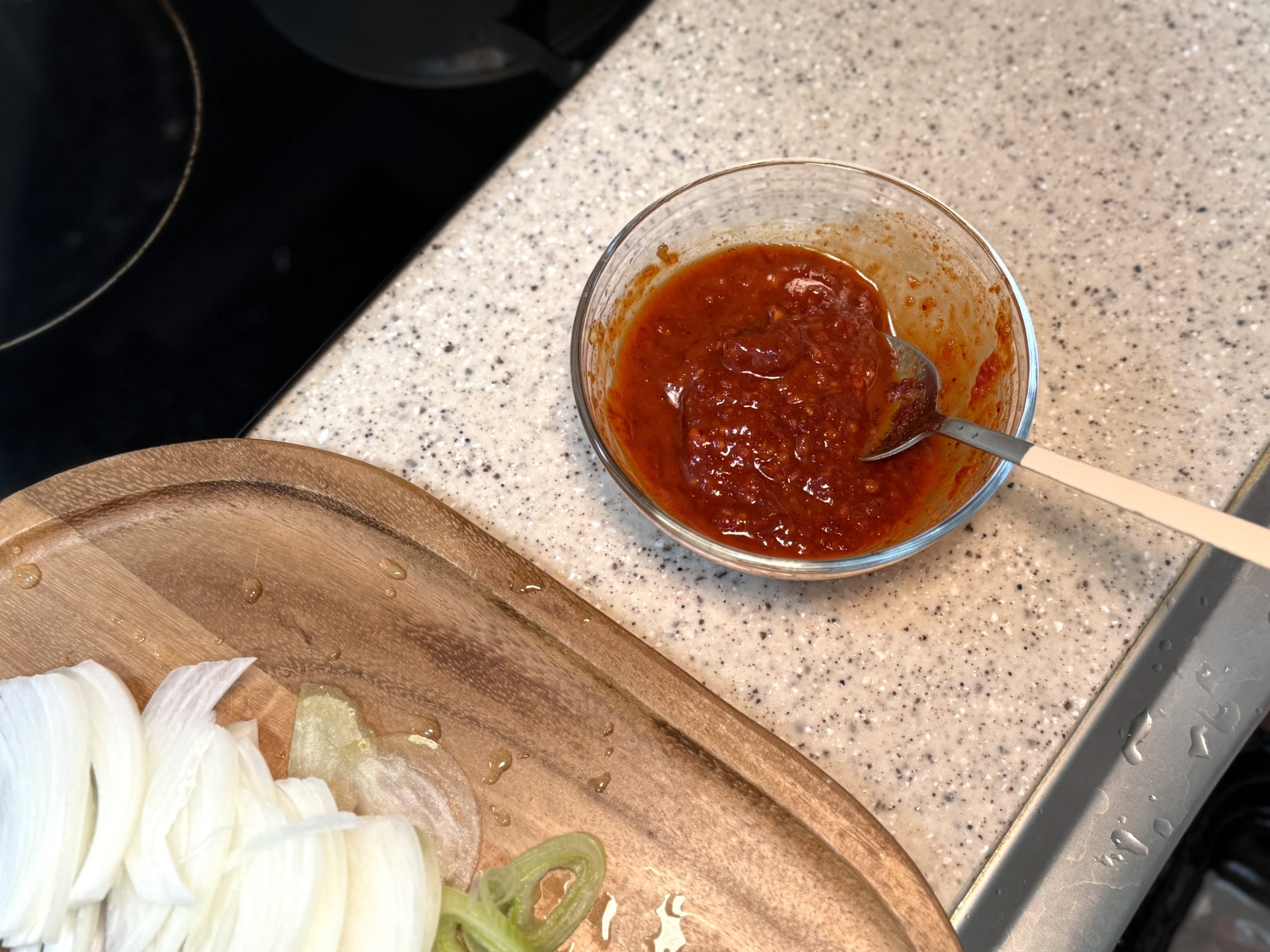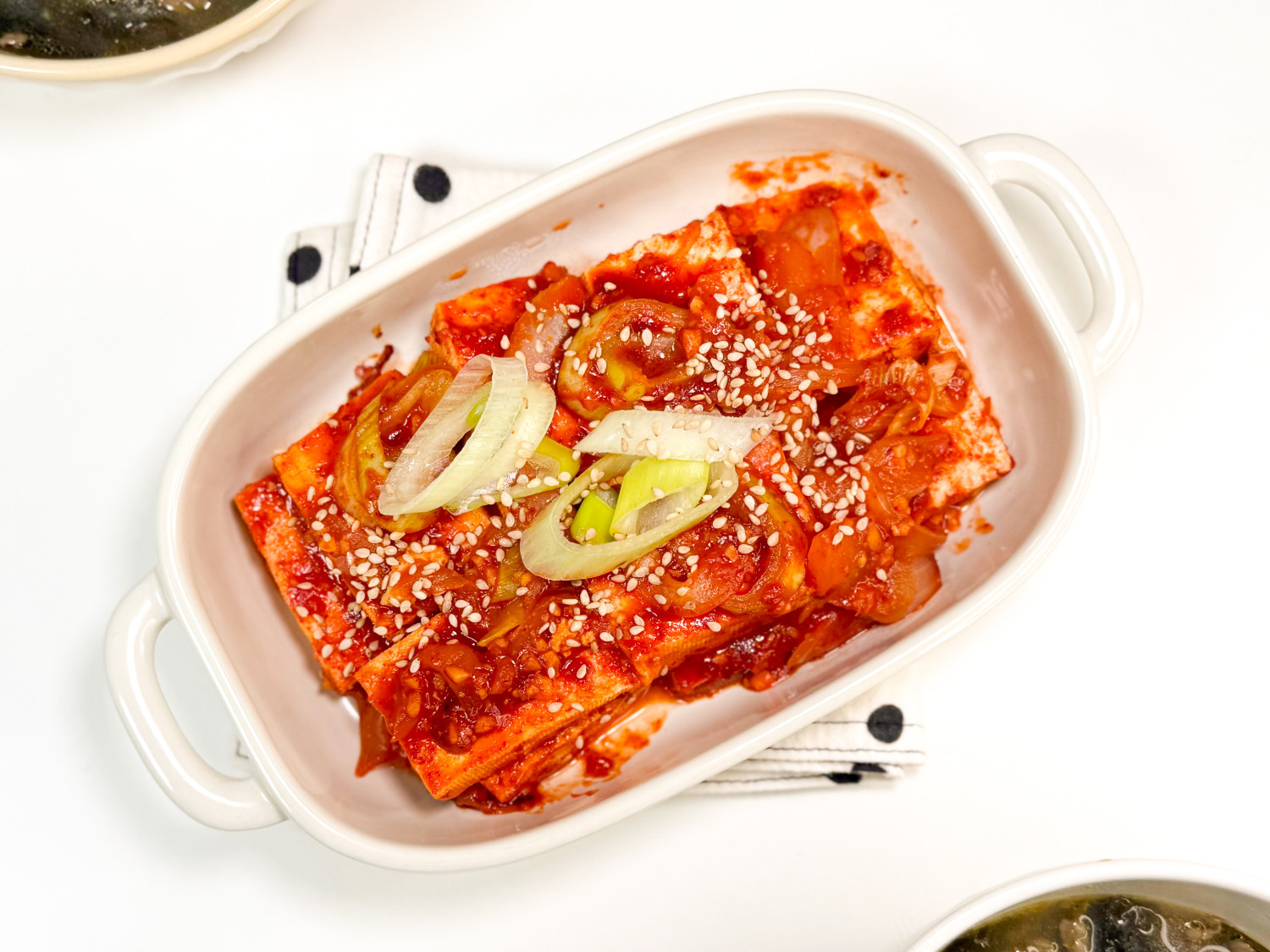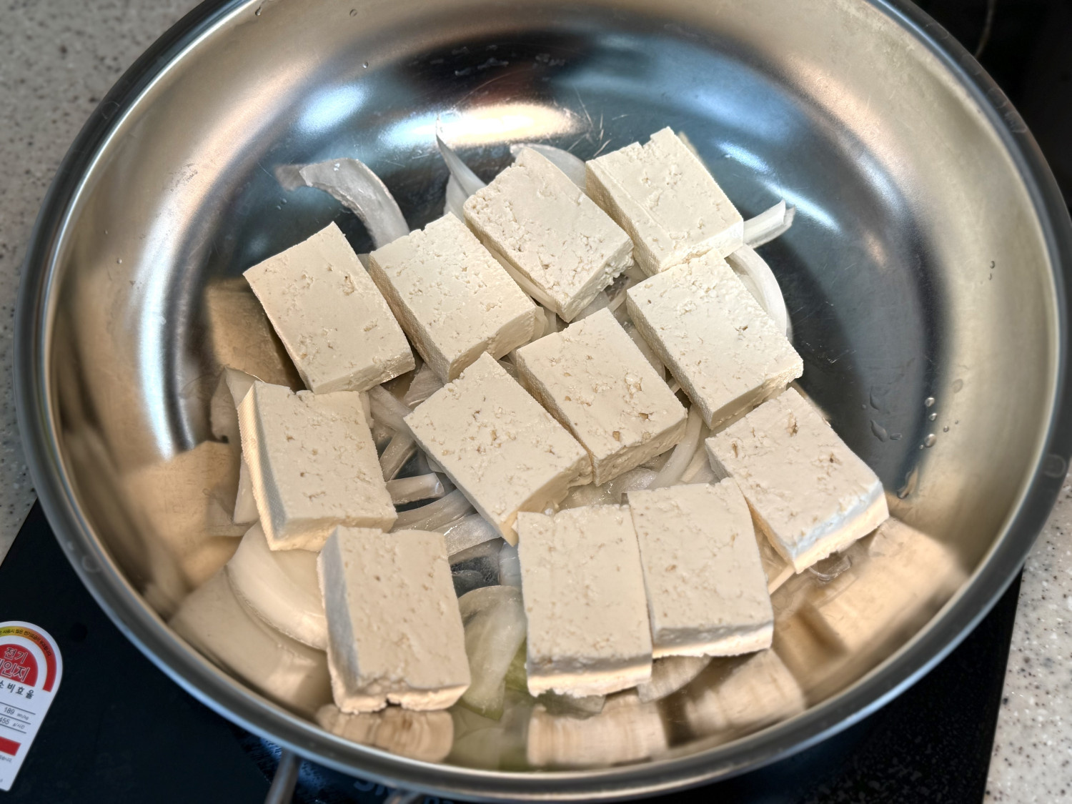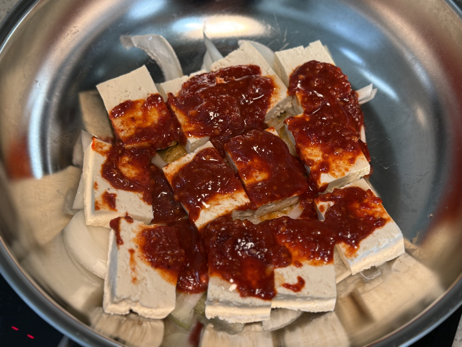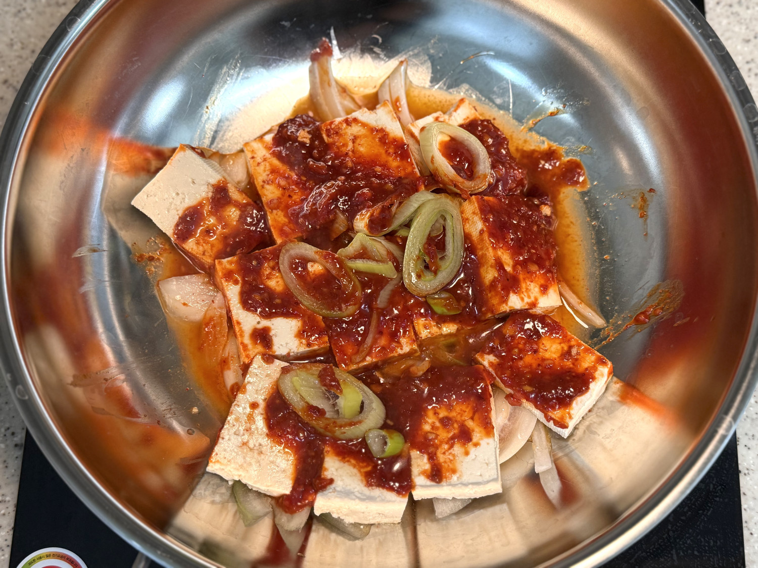 두부 1 모 , 양파 1/2 개 , 대파 , 고추장 2 스푼 , 고춧가루 1 스푼 , 간장 1 스푼 , 다진마늘 1 스푼 , 설탕 1 스푼 , 참기름 1 스푼 , 물 3~4 스푼