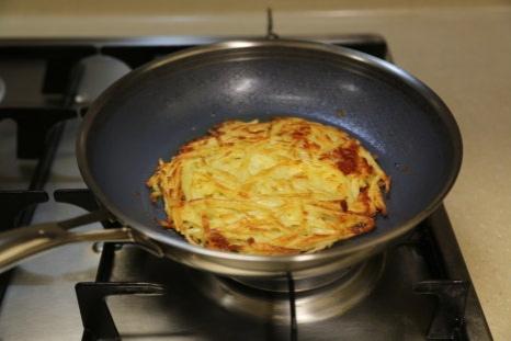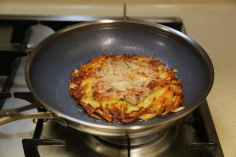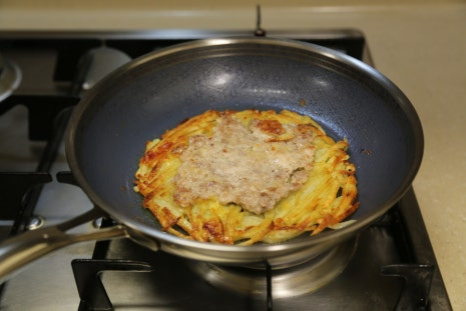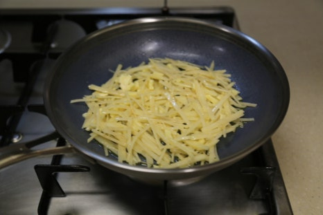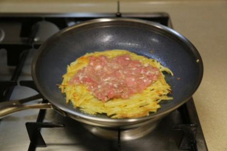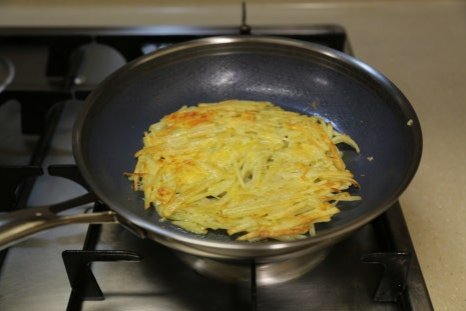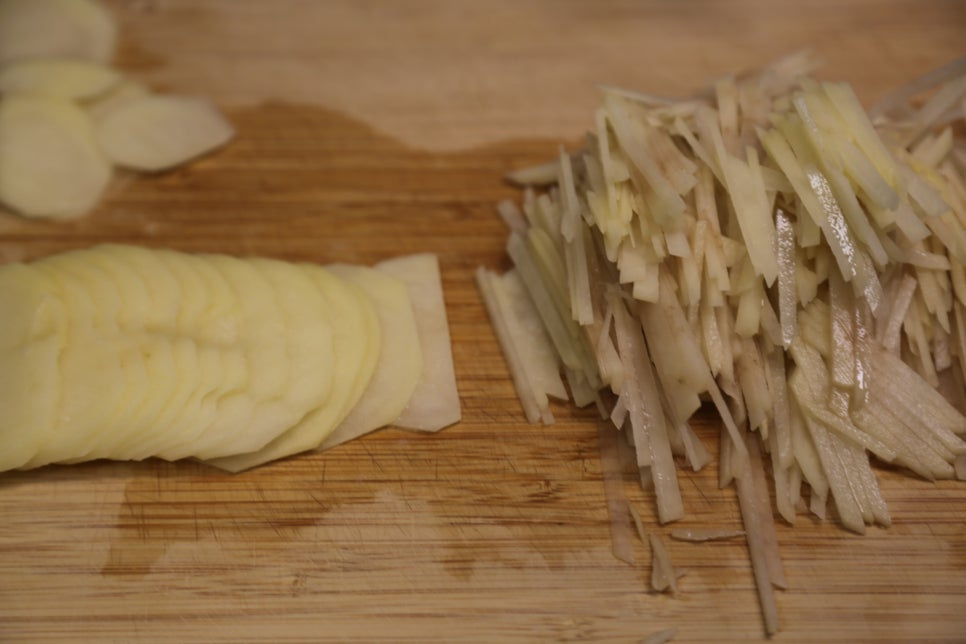 감자를 얇게 채썰어 치즈와 섞은 후 돼지고기 다짐육을 올려 바삭하고 쫀득하게 부친 감자채전입니다