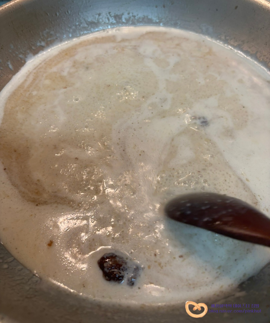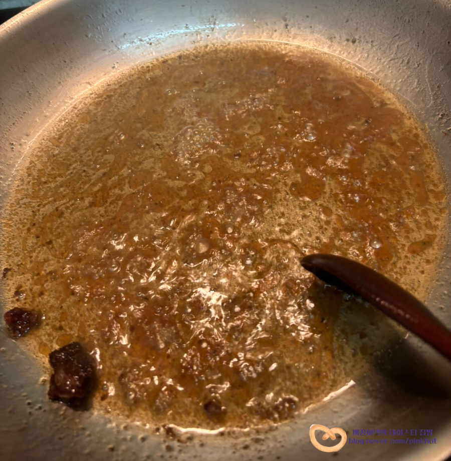 여기에 고기 구웠던 기름과 생크림을 활용해서 소스를 만드는 것이 두번째 포인트예요.