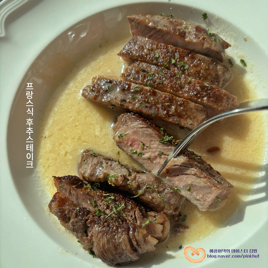 스테이크 소스 만들기 할 때 고기 기름을 활용하면 감칠맛이 더 좋아지잖아요 부드러우면서 고급스러운 맛이 잘 느껴지는 정통 프랑스식 스테이크 완성하실 수 있어요.