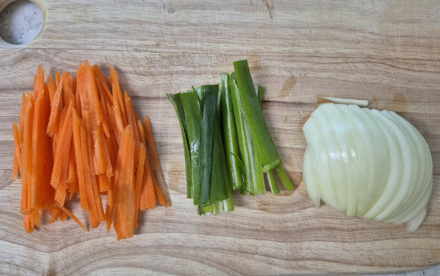 사각어묵 3장 , 당면 200g , 양파 1/2개 , 당근 1/4개 , 느타리버섯 한줌 , 대파 반대