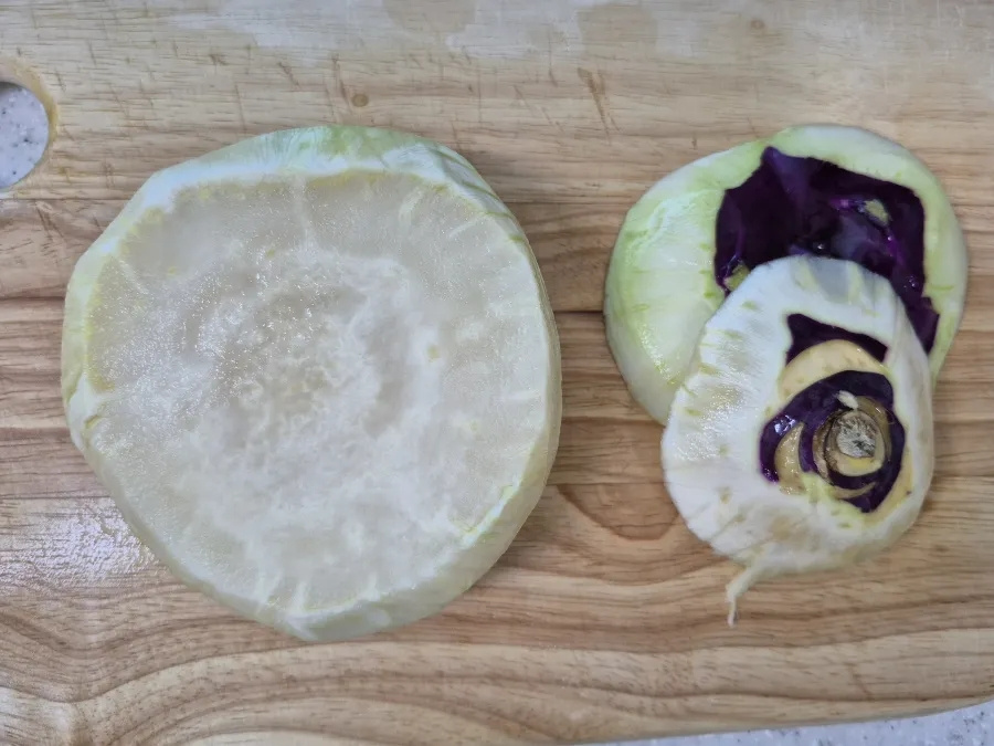 ✔️콜라비의 꼭지와 밑동 부분을 약간 도톰하게 잘라야 질긴 섬유질이 제거돼요.