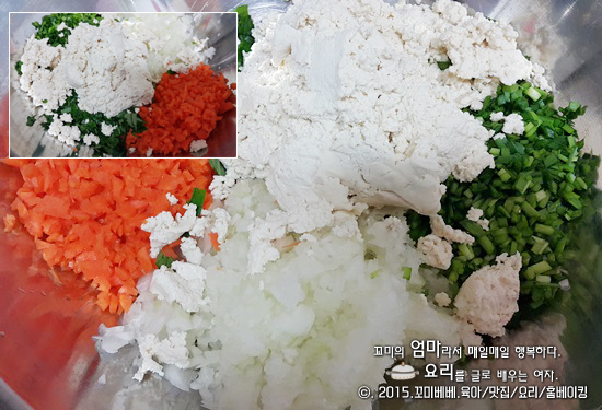 # 채소 및 두부의 물기를 최대한 빼주셔야 나중에 만두 만들 때 물이 생기지 않고 끈기 있게 잘 뭉쳐져요!
