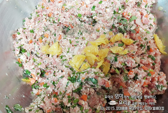 대충 섞어주신 다음 다진마늘 + 후추톡톡 넣어주세요.. 아무래도 고기가 들어갔기 때문에 혹시나