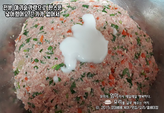 아기굴림만두 속 재료가 서로 겉돌지 않게 열심히 치대주세요♥