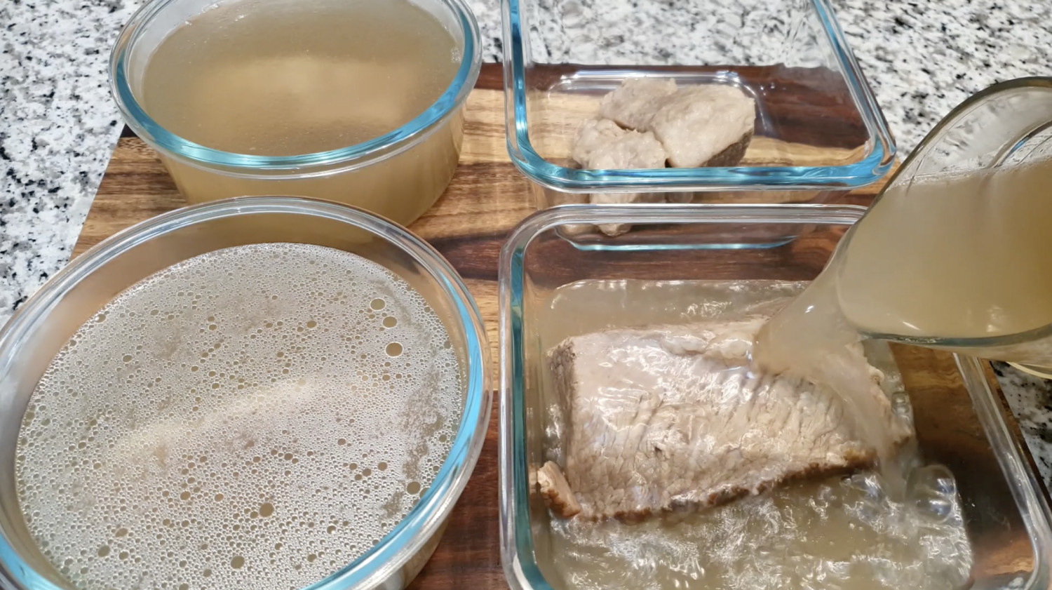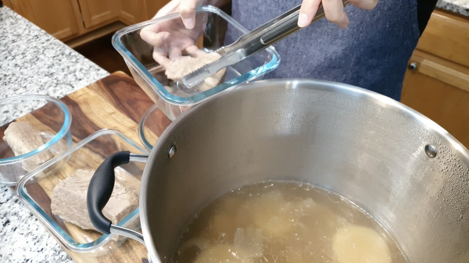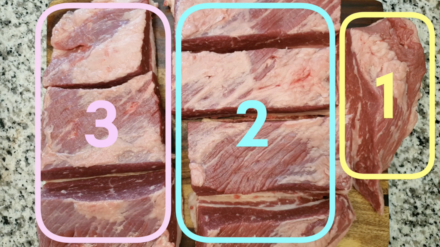 1번과 3번 부위의 고기를 삶아서 고기육수와 수육을 만들거예요.