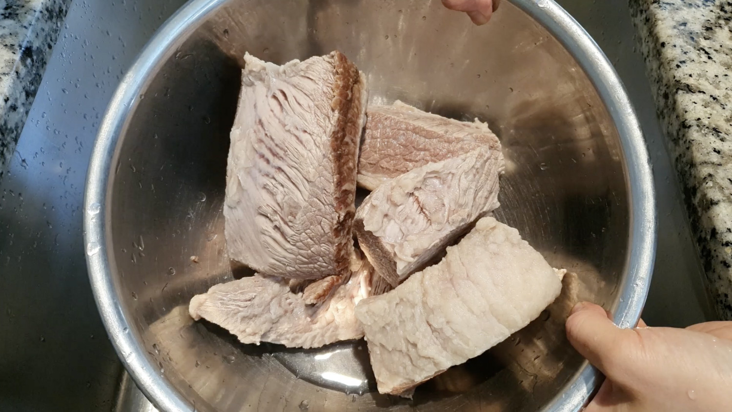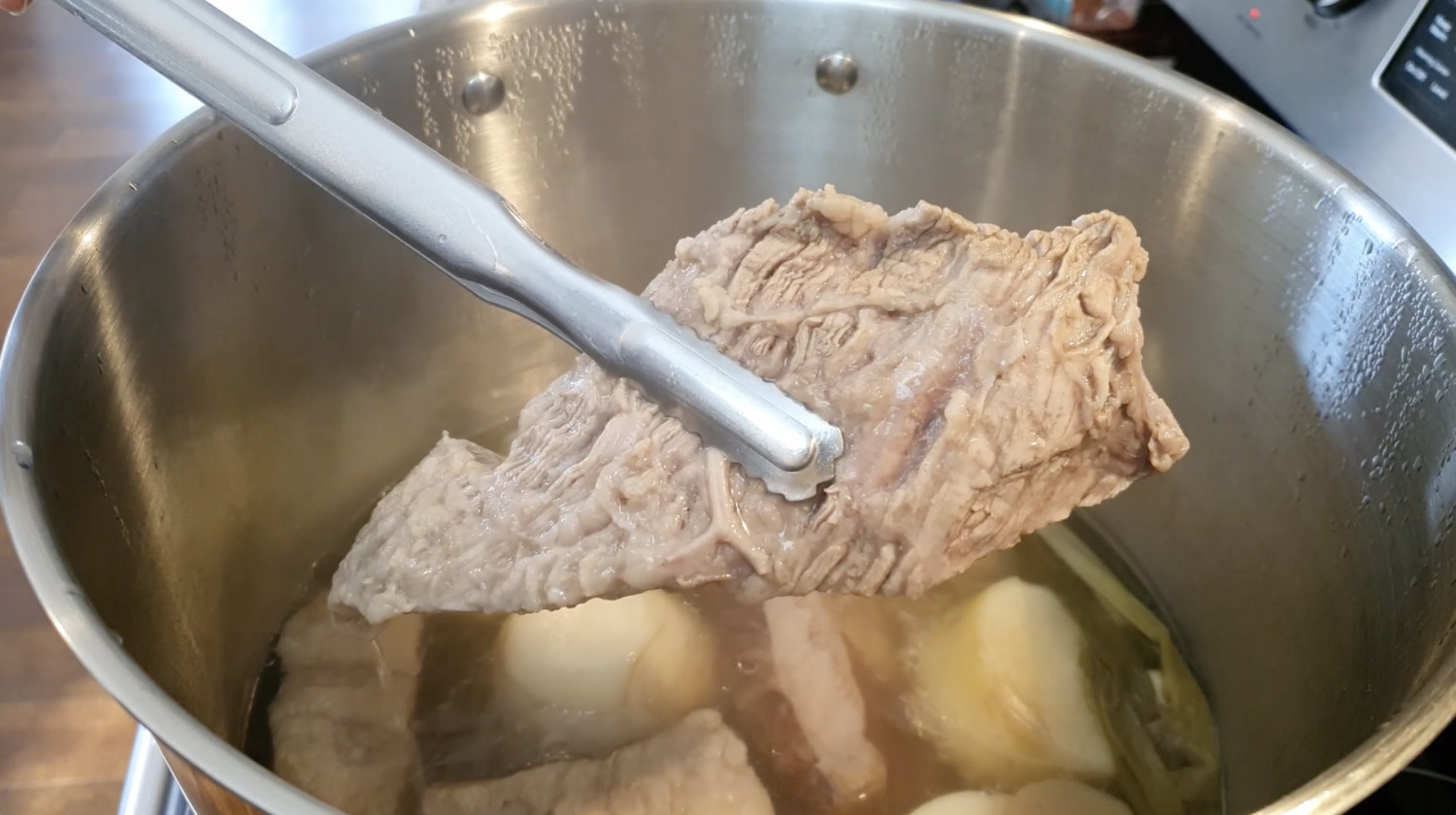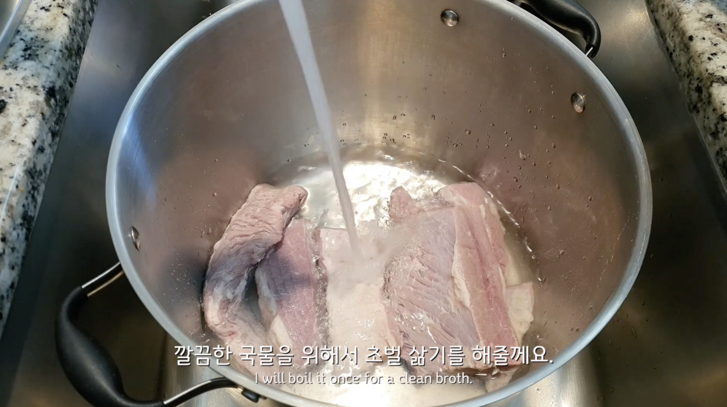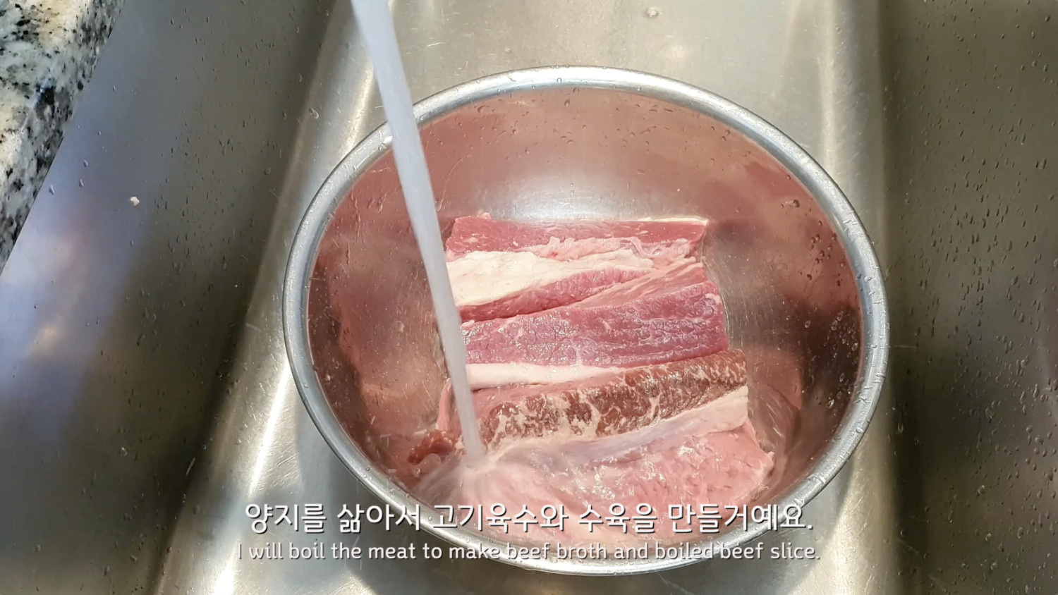 끓는 물에서 10분 삶은 후 첫물은 버려주세요. 이제 양지가 준비되었어요.