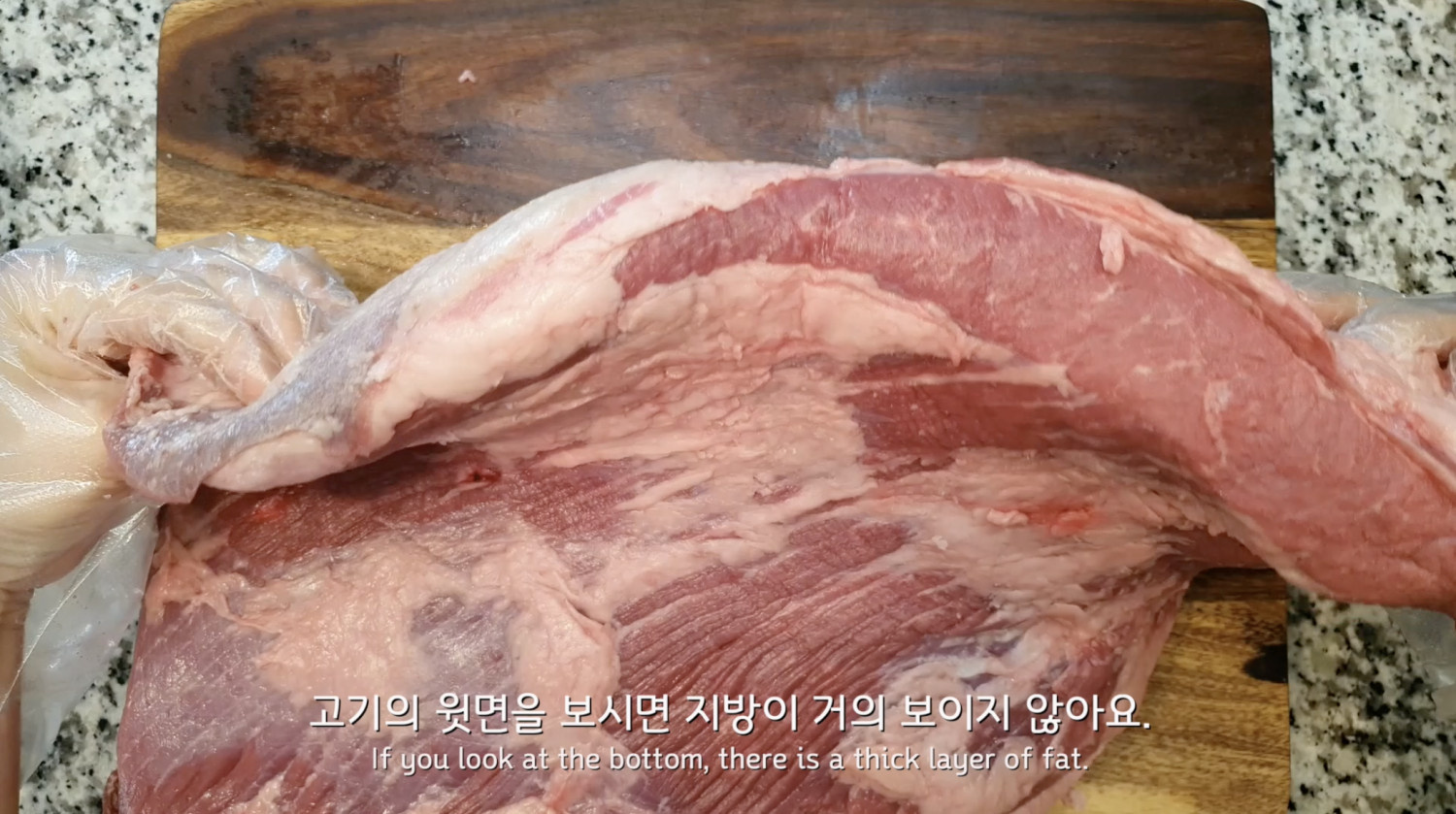 고기의 아랫부분을 들어보시면 두꺼운 지방이보이실 거예요.