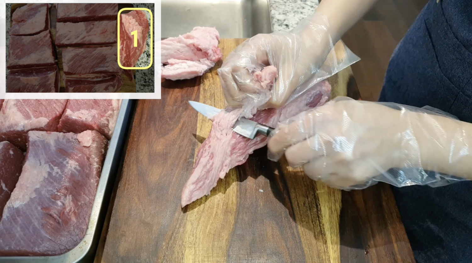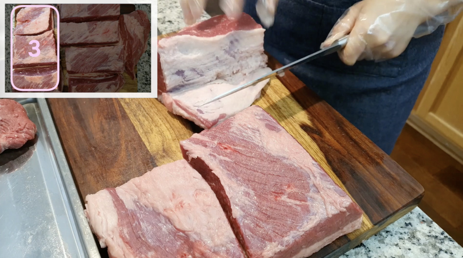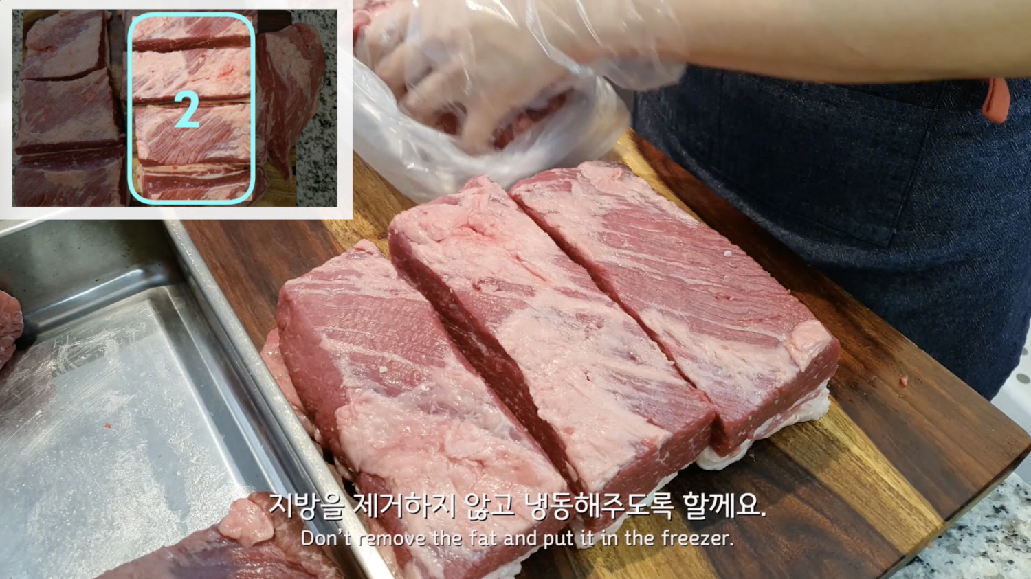 2번 고기들은 얇게 썰어야 하고 지방이 적당히 붙어있어야 구워 먹을 때 맛이 좋아요. 지방을 제거하지 않고 냉동해주도록 할게요.