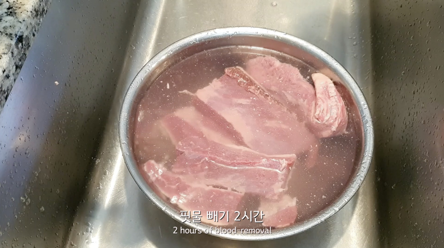 먼저 찬물에 담가서 2시간 동안 핏물을 빼줄게요.