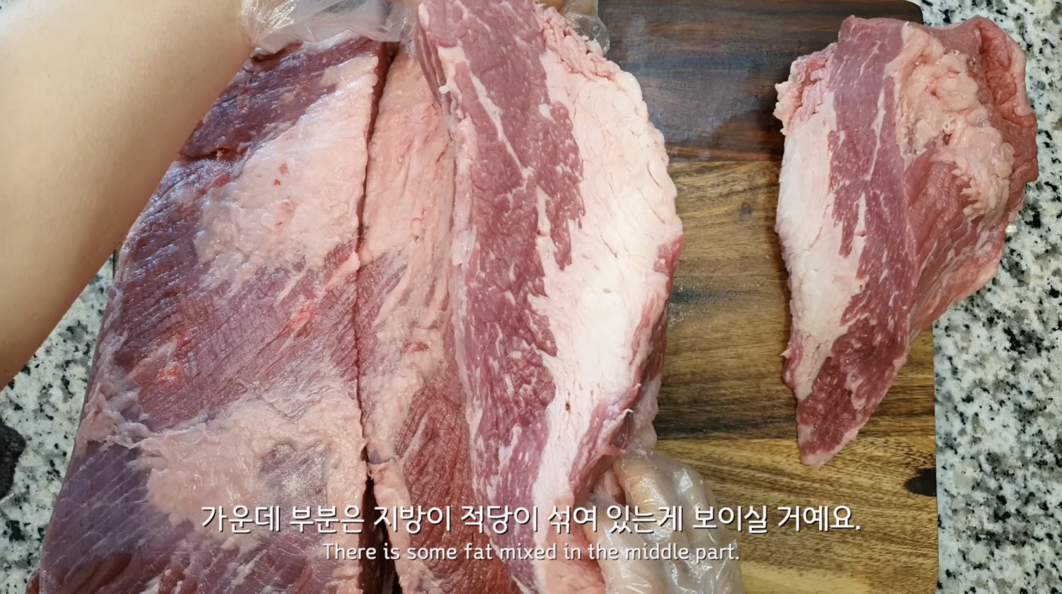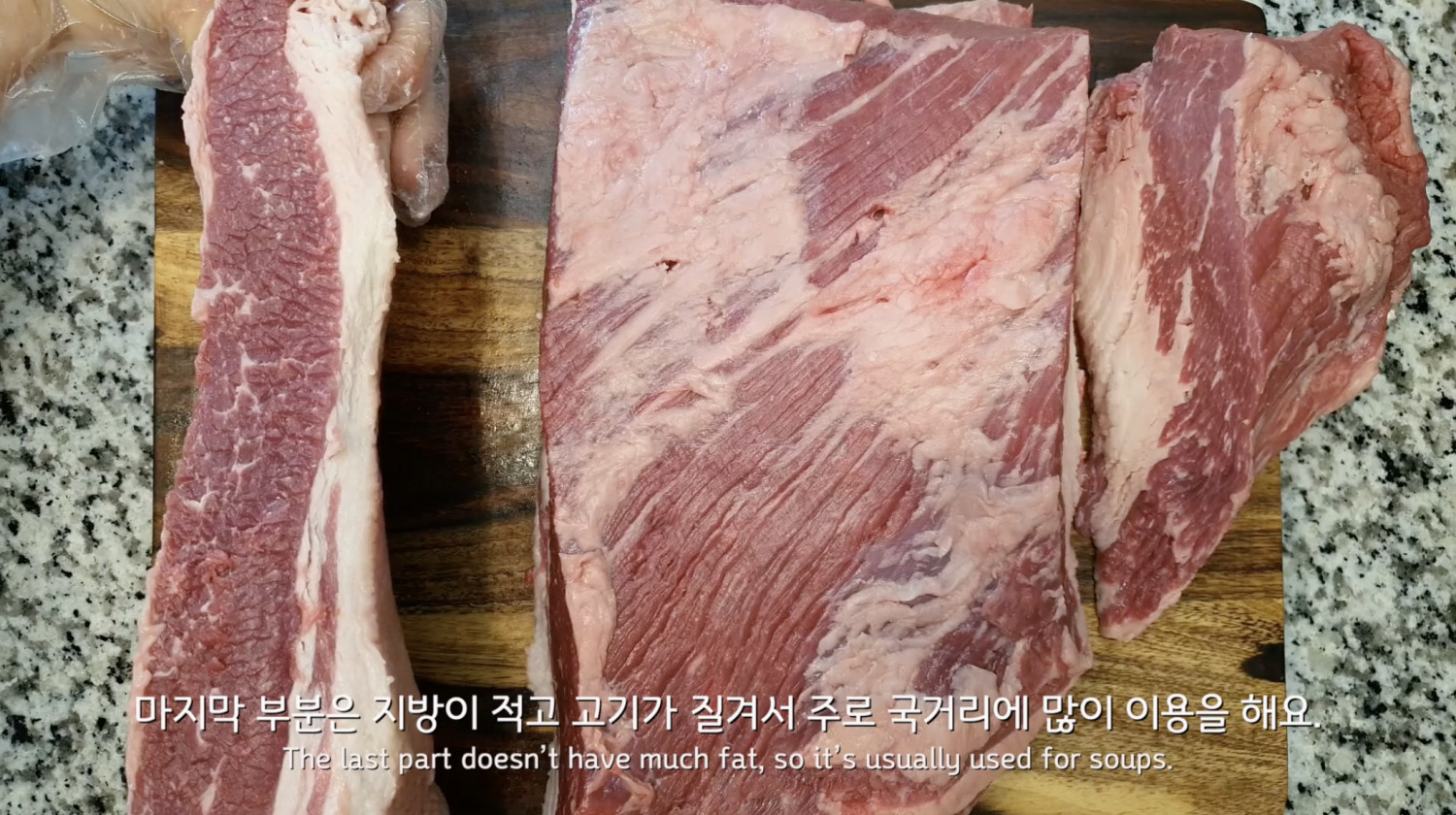 마지막 부분은 지방이 적고 고기가 질겨서 주로 국거리에 많이 이용을 해요.
