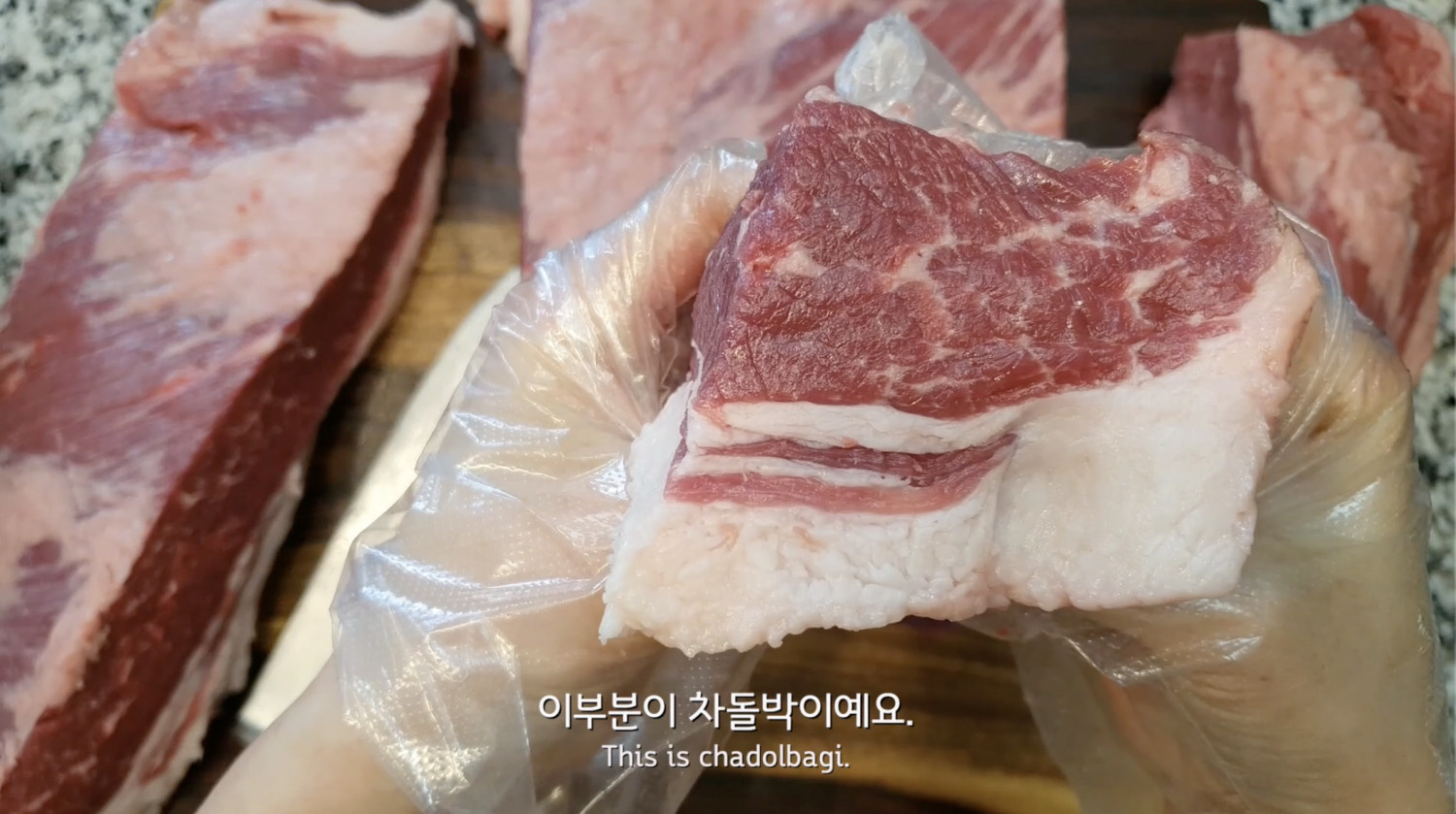 이 가운데 부분을 우선 크게 4덩어리로 잘라주세요. 이 부분을보시면 차돌박이의 모습이 보이실 거예요. 이 부분도 지방이 적당히 섞여 있어서 구워 드시기 좋아요.