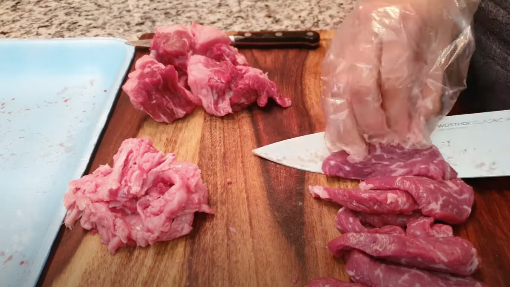 생고기라 칼로 써는 게 쉽지 않아요.