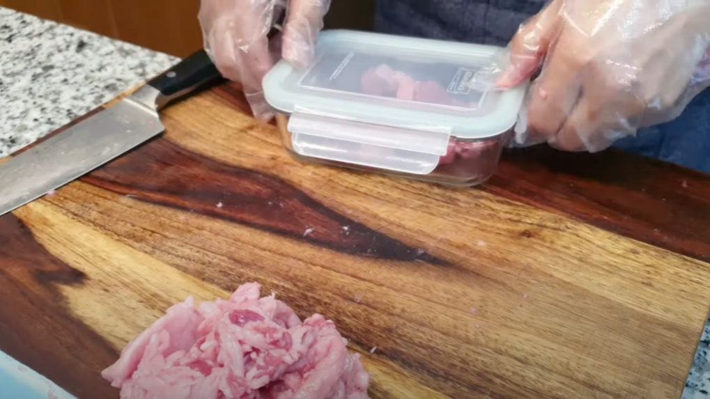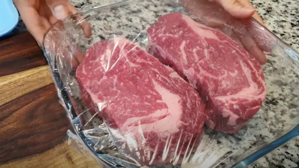 이렇게 스테이크용으로 자른 고기는 용기에 담아 래핑해 두었어요.