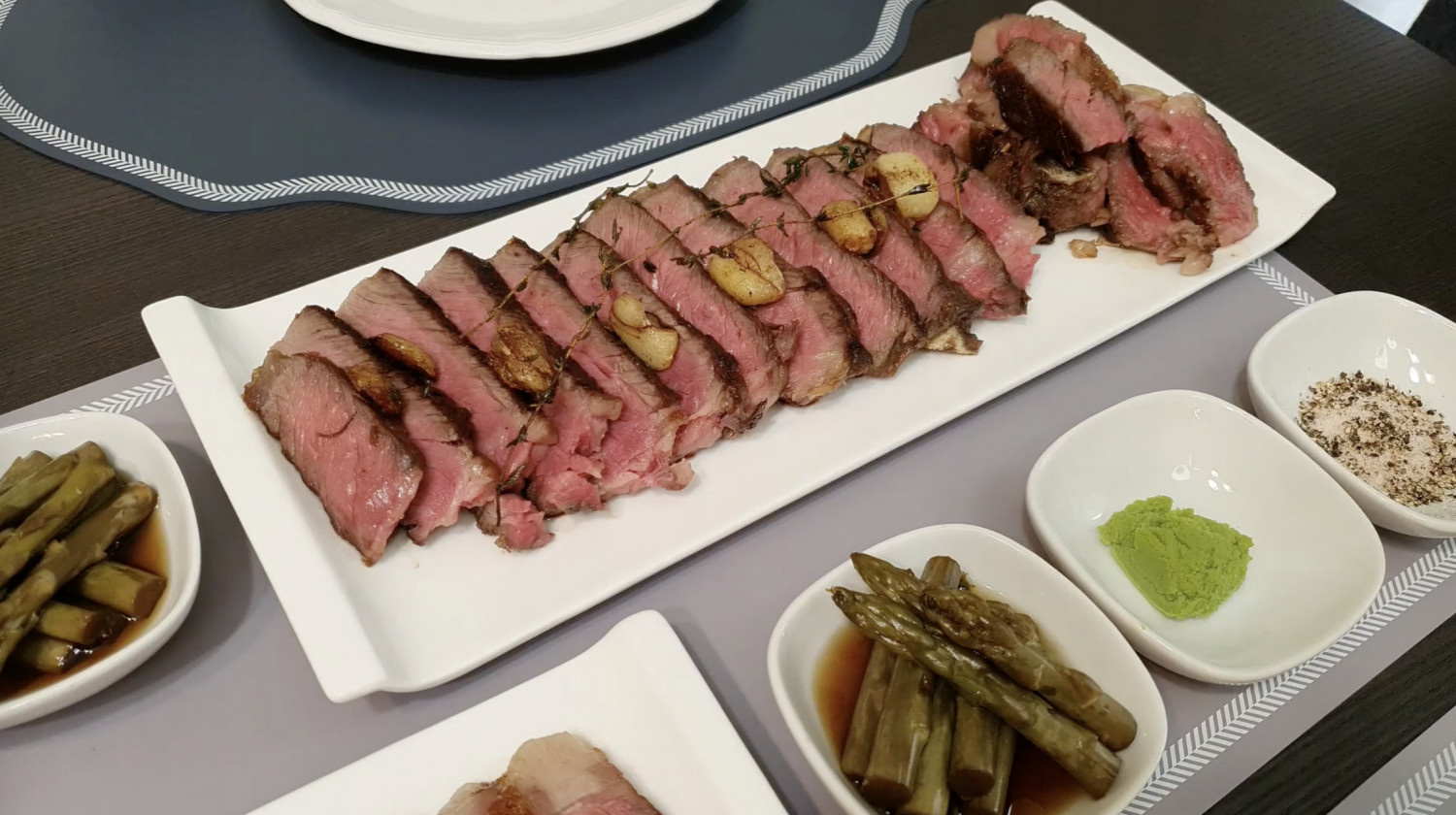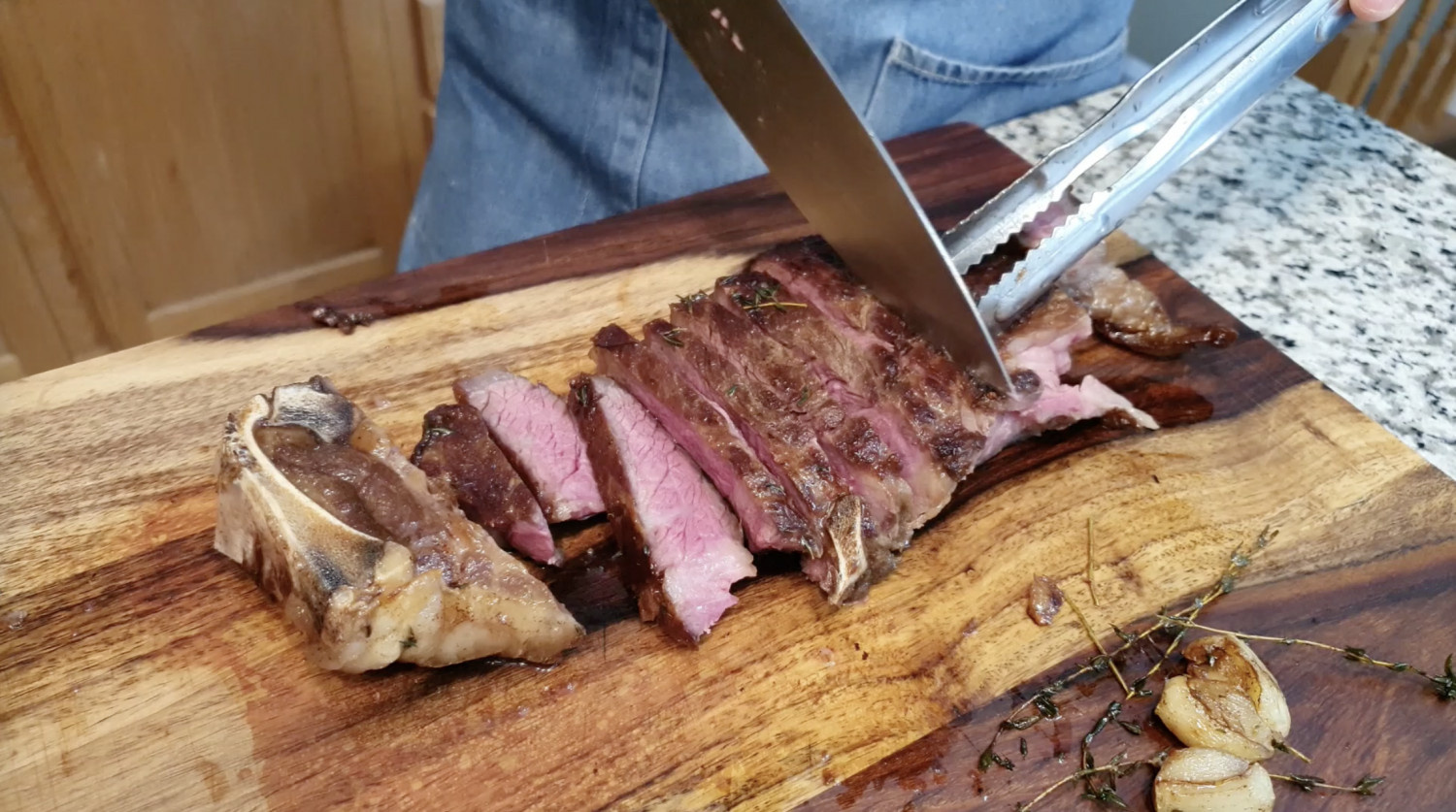 드라이에이징한 고기는 뼈를 제거하고 얇게 썰어 주세요.