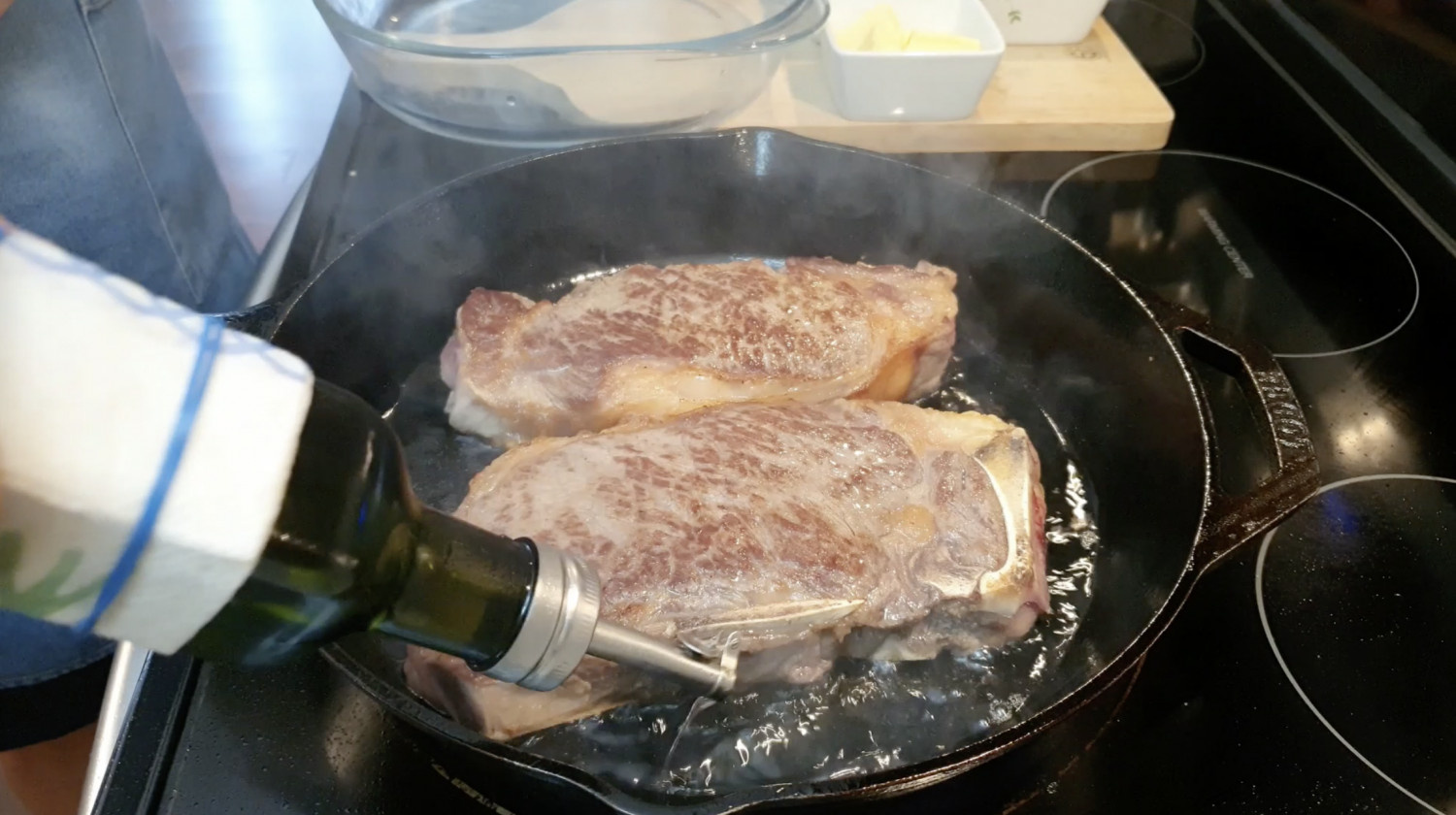 추가로 아보카도 오일을 뿌리고 기름을 모으고 그위에 고기를 얹어주세요.