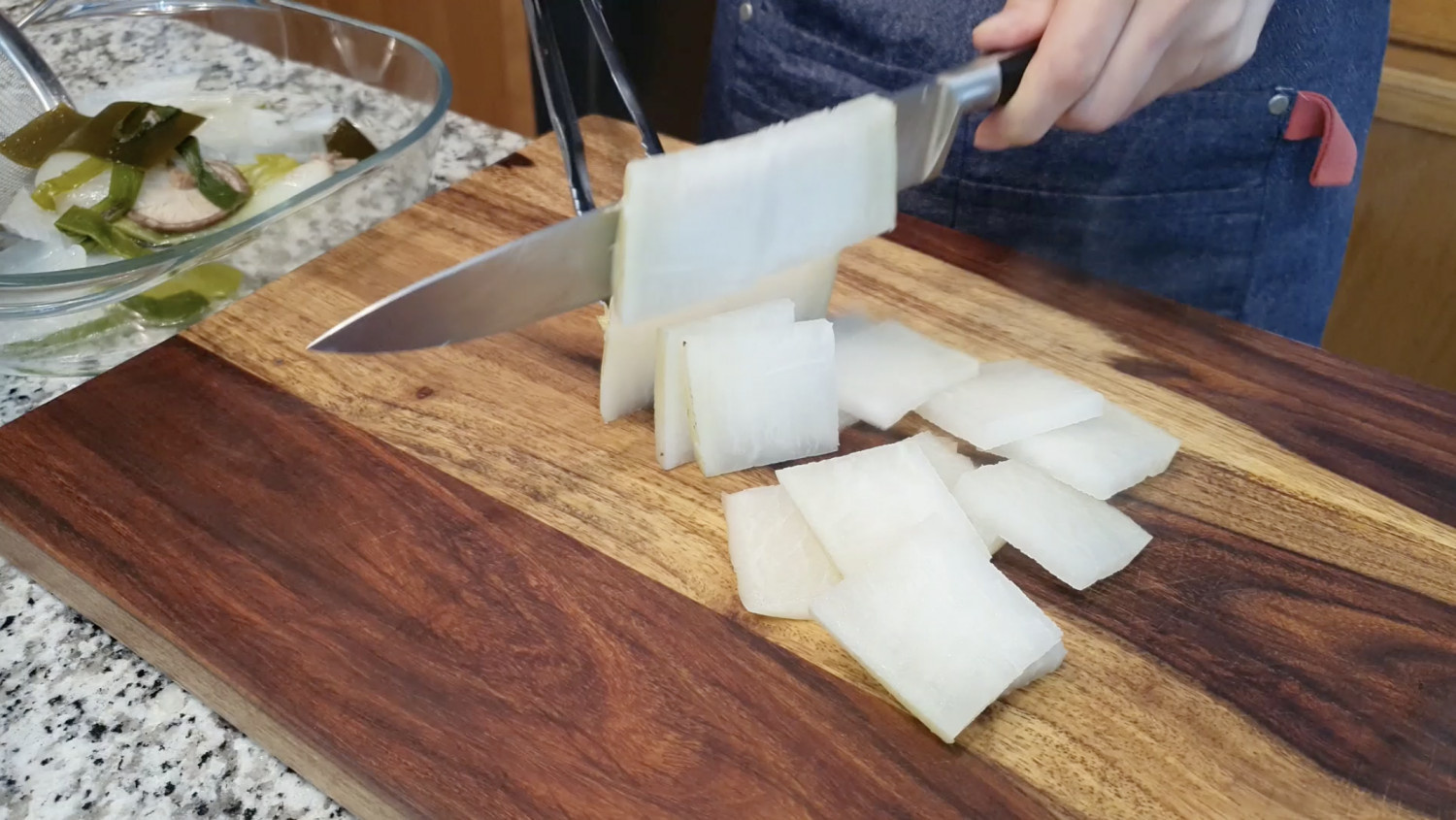 건져낸 무는 먹기좋은 크기로 썰어주세요.