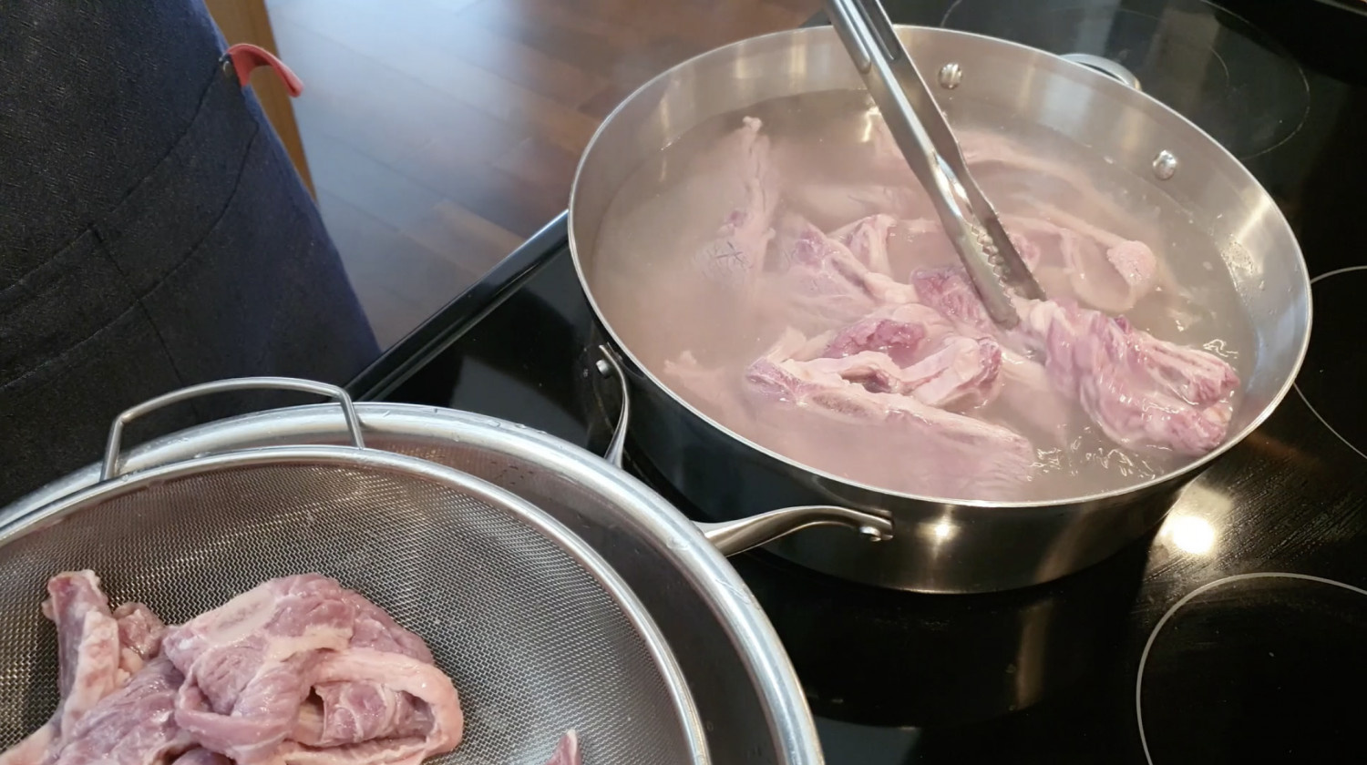 데친 고기를 따뜻한 물로 씻어주세요.